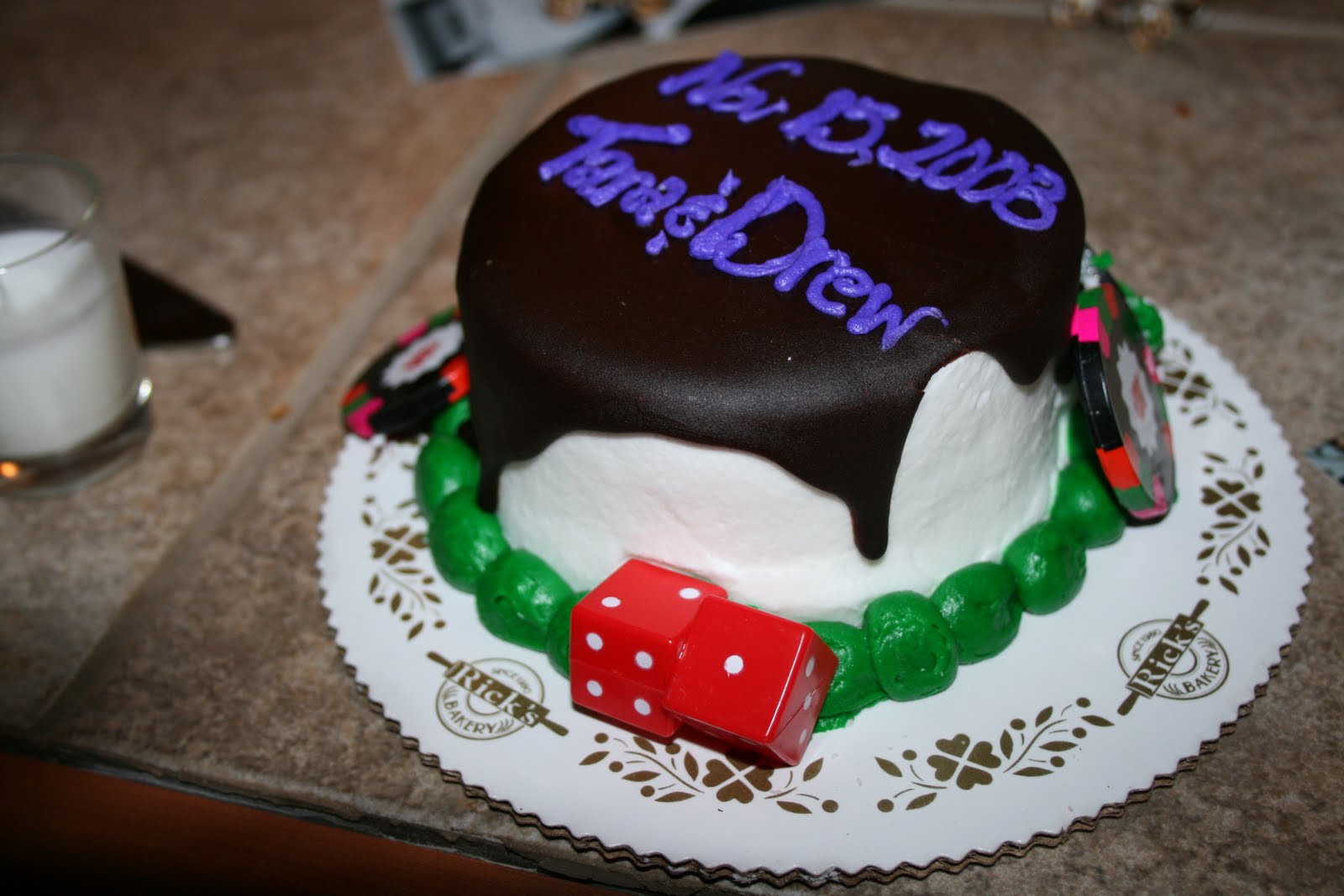 So I mentioned a couple weeks ago that I had a surprise for Drew and I actually kept it a secret… well KINDA haha. I had all these plans to show him in Vegas but I ended up showing him the Friday before we left. haha I know, BAD Tara! BUT it was worth it. I decorated the whole house in candles, had wedding pictures everywhere, a mini Vegas inspired cake, and wine.