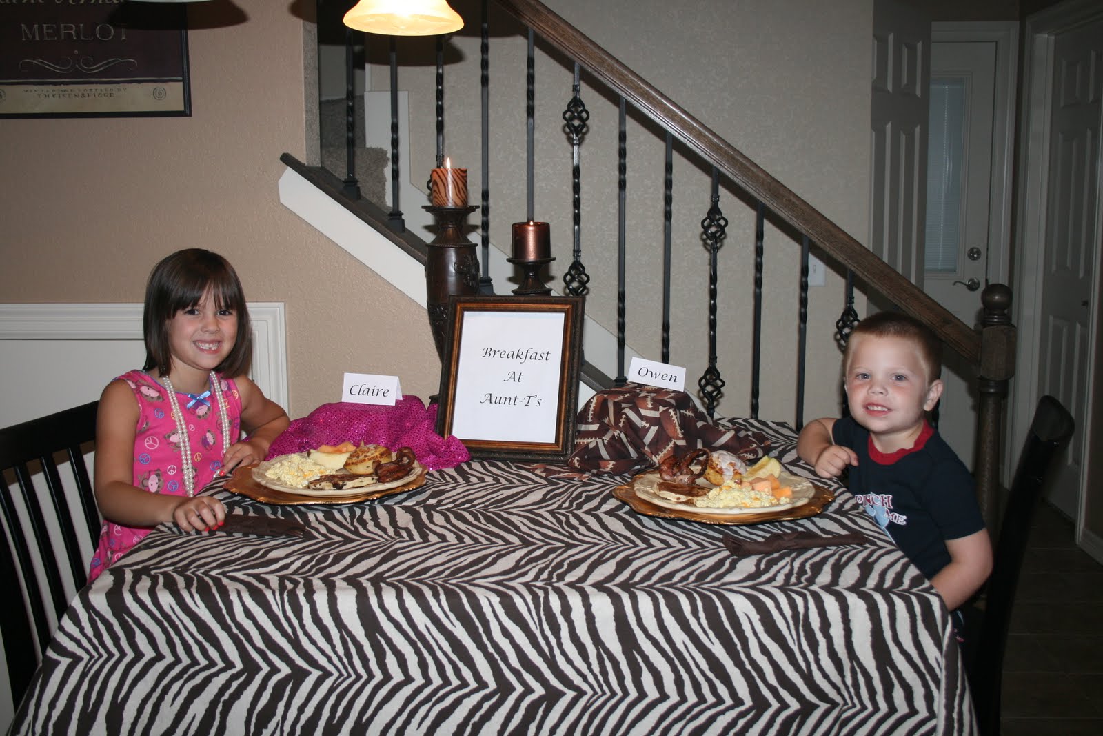 Miss Claire and Mr O came and stayed the night with Drew and I last night. We were trying to think of something fun to make for dinner so they decided on BREAKFAST! YUM. So I didnt hold back and made them chocolate chip pancakes, cinnamon rolls, cheesy eggs, bacon, fruit and OJ. Claire wanted to set the table all pretty so I made some place settings for them. Owen LOVES footballs so he was so happy and of course claire loves hot pink with sparkles like her Aunt T. We even all got dressed in our PJs for dinner. My sister Nicole came over and joined us for a Movie which was Free Willy : ) We had tons of fun like usual.