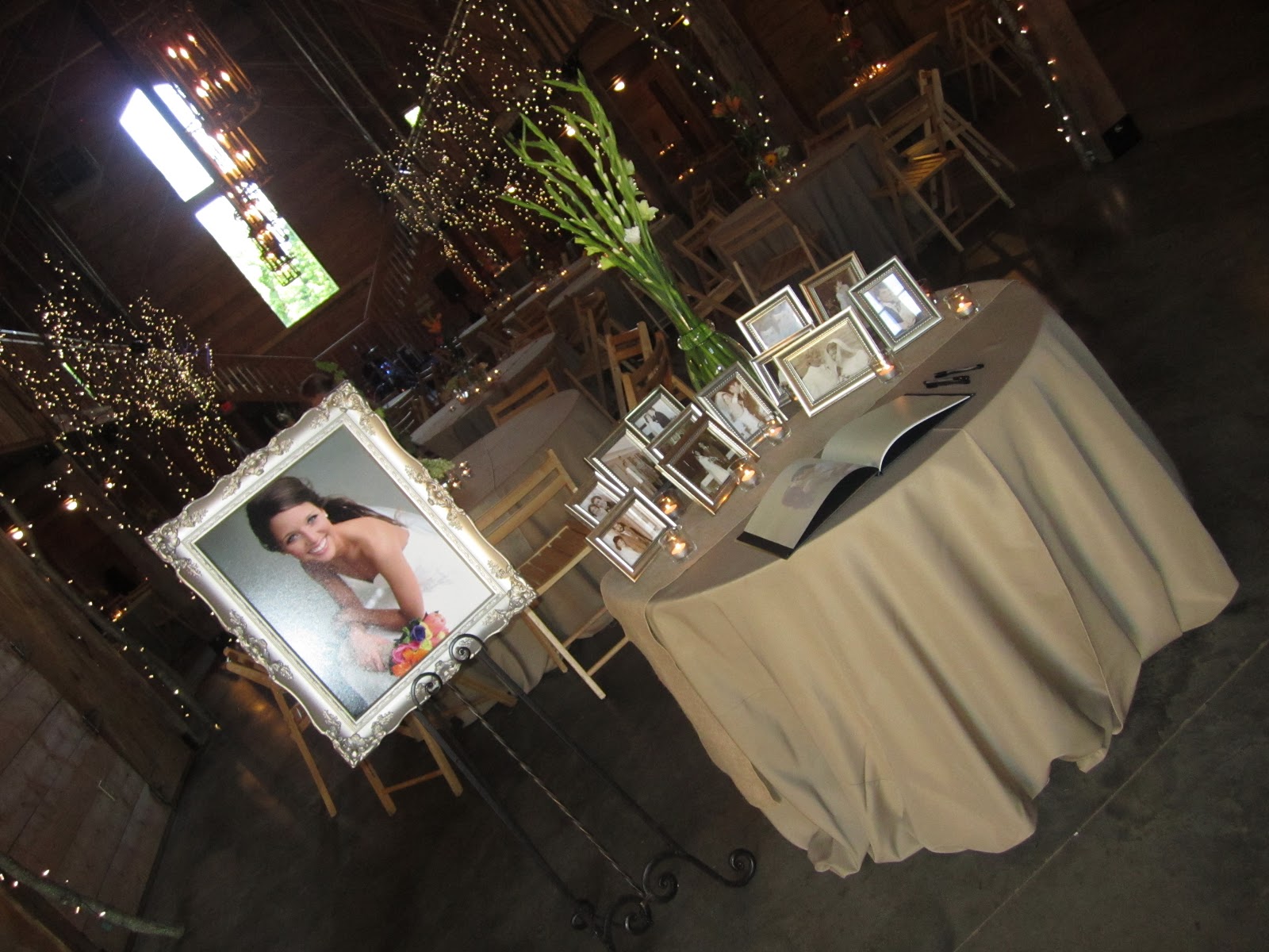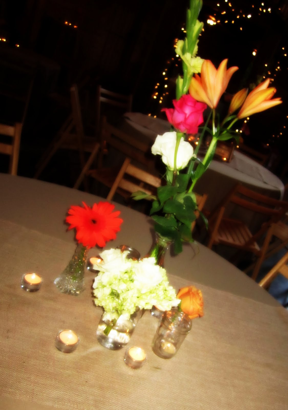 Saturday I got up bright and early to go set up Hillary’s reception! Boy was I kinda nervous at first. I have done lots of birthdy parites, showers, etc, but never a wedding! But after talking to Hillary I was really excited! Hillary was very very organized and knew exactly what she wanted. She had been collecting all sorts of sizes of vases for the flowers. She had her reception at the pratt place barn, which is gorgeous by itself. Such a fabulous canvas to work with. Hillary had a lot of neutral tones with bright flowers. I spent the day putting together her vision. She was thrilled with the results, which made me so happy. : ) Hillary was a STUNning bride and Stephen and her are just the most adorable couple. There will be lots and LOTS of pictures to come from the one and only Benfields and will post a link to them once he gets them up. : ) But here are a few I got.