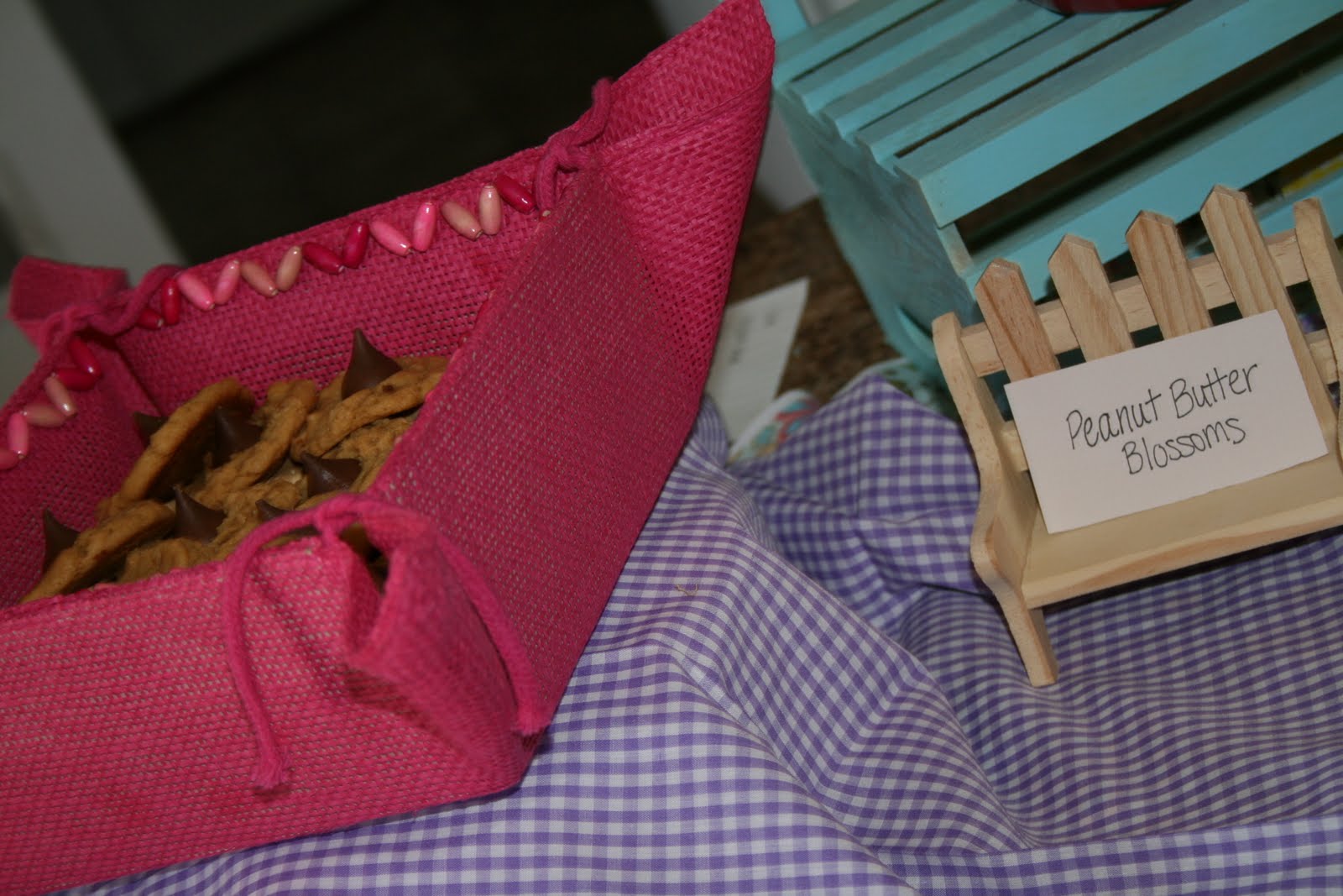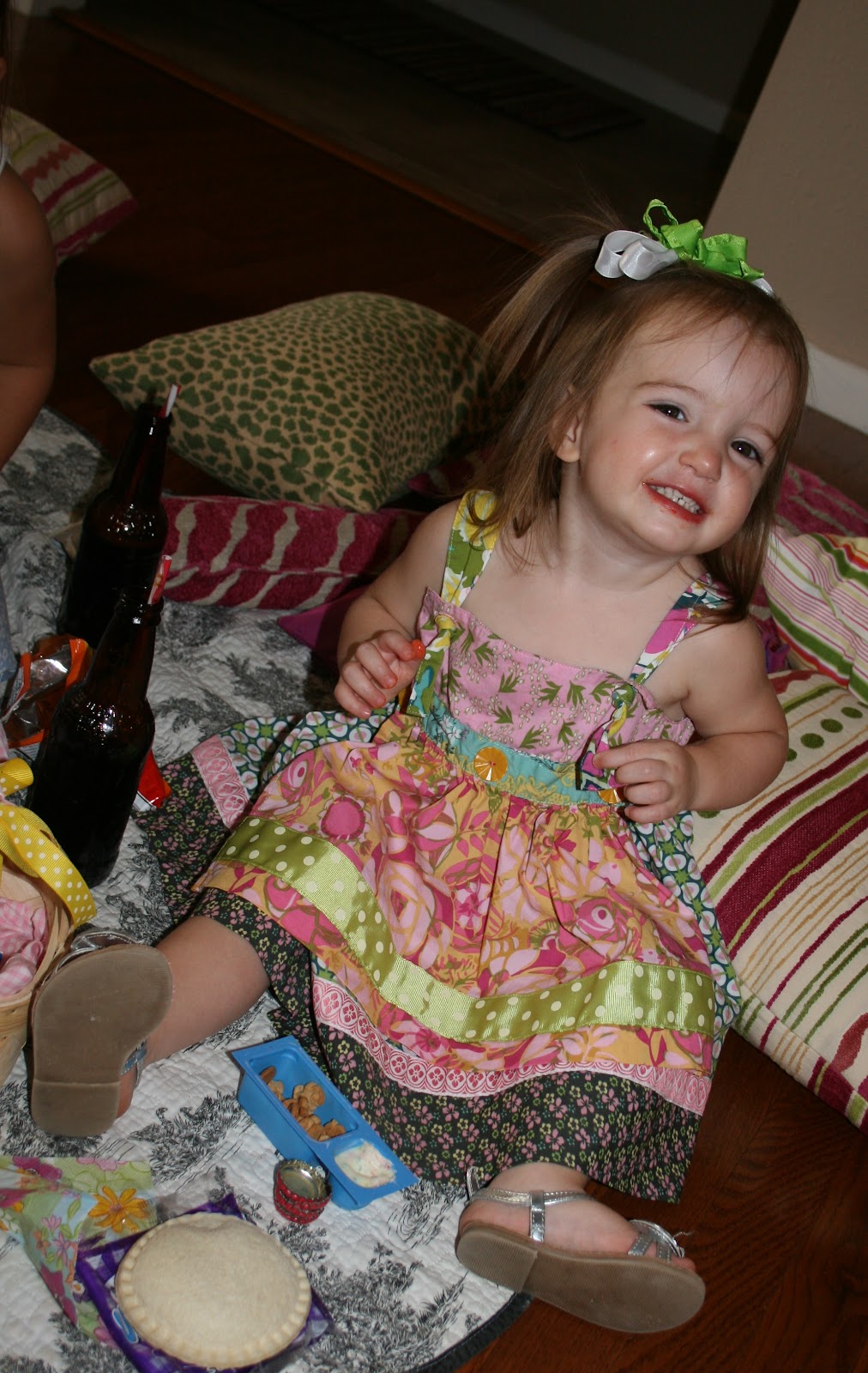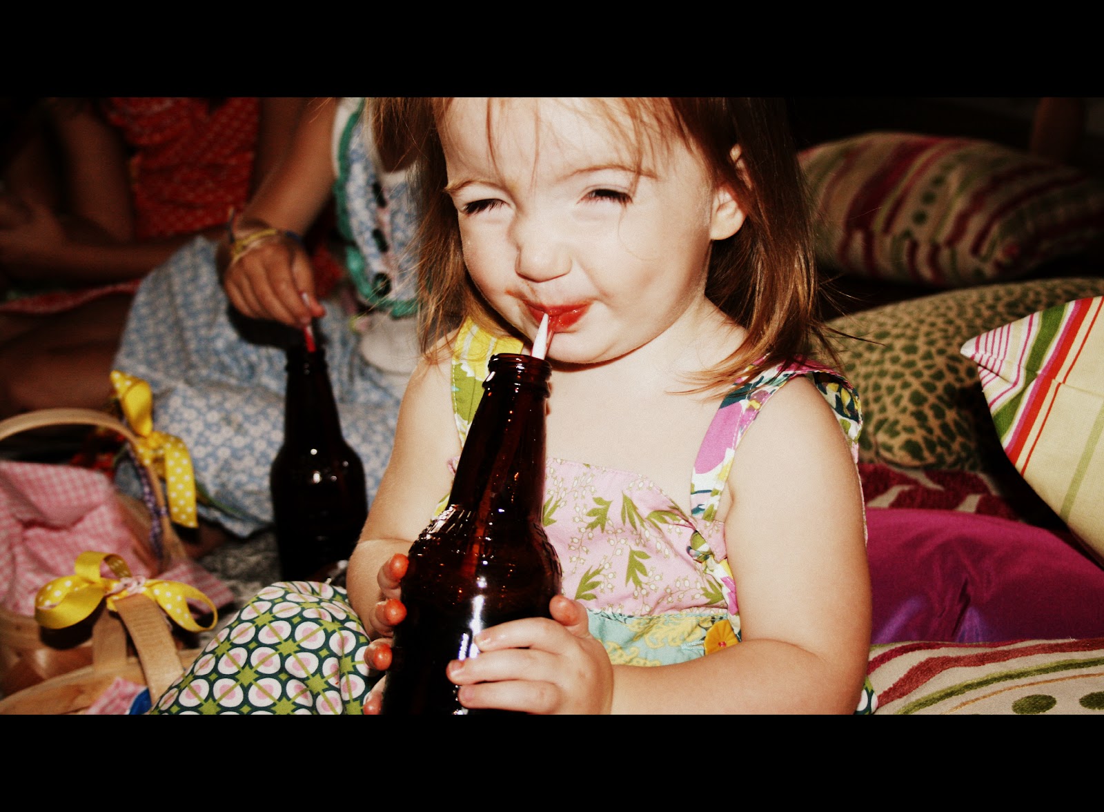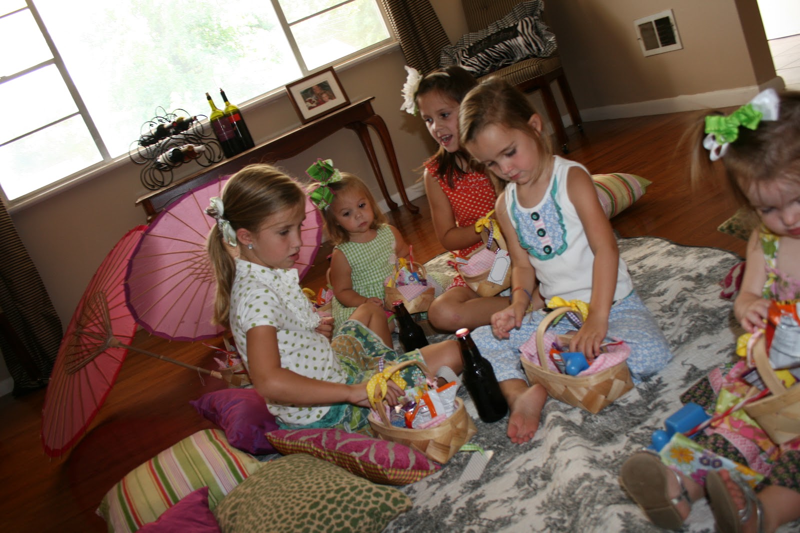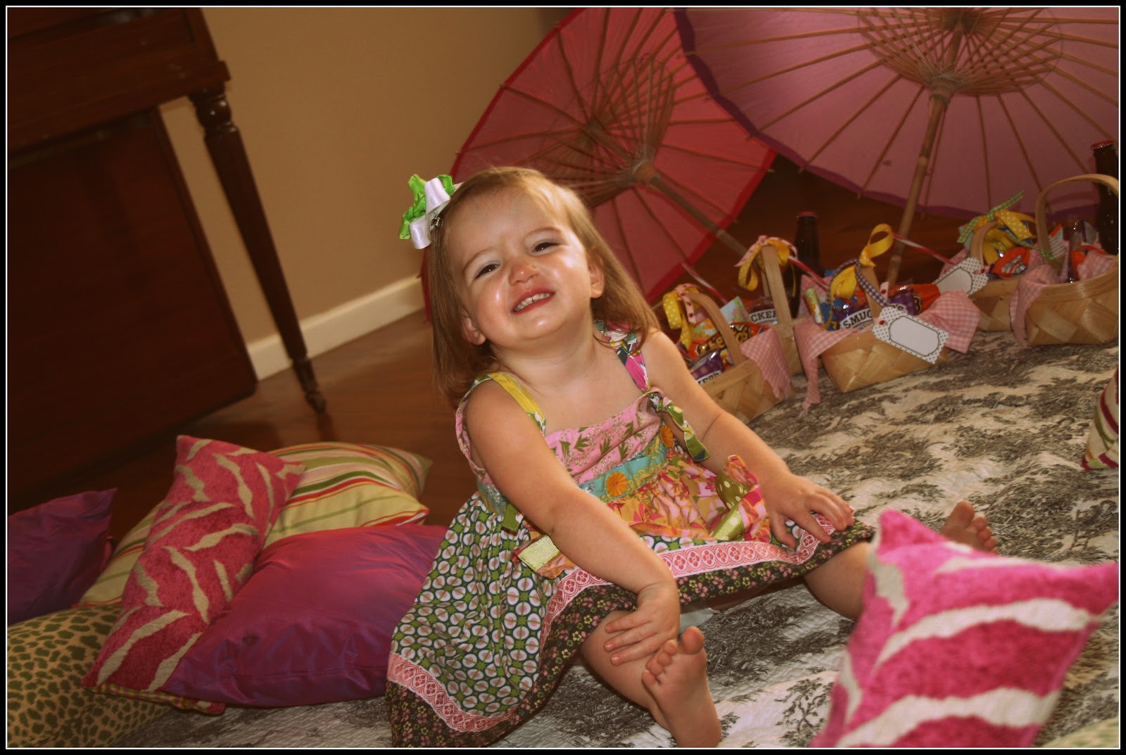 Saturday I got up early and headed over to Boni’s to start decorating. I just LOVED this theme. Its hard to think of a theme for a younger child and even harder when its 100+ degrees outside! So the idea of an indoor picnic came to mind and I ran with it. I wanted the picnic to look like a lounge area. My mom makes pillows for every season, so it was a easy choice to use her summer ones. The colors screamed loungy summer. I then got some umbrellas and of course picnic baskets. I made picnic baskets for each child and used Catherine’s favorite foods, pb&j, cheetos, dunkaroos,and rootbeer. I then blew up blue and white balloons and put them above the picnic area to resemble the sky. It turned out soooo cute! Then it was time to decorate the cookie/lemonade table. I saw a CUTE picture online of a lemonade stand so I made a smaller version for this table. It was so easy to put together and so adorable. I baked cookies on a stick and them placed them on top of chocolate and sprinkle rimmed glasses of milk. I also had three baskets of goodies on the table. I found adorable picket fence pieces, picnic chairs and a tiny puppy(Catherine LOVES puppys) and used them for decoration as well. The colors were just so so perfect. I loved how it turned out. After the kiddos ate their lunches, I had flower pin making kits for each kid to make. They loved putting them together. The party was so much fun and Catherine was smiling the entire time. Here are TONS of pics : )
