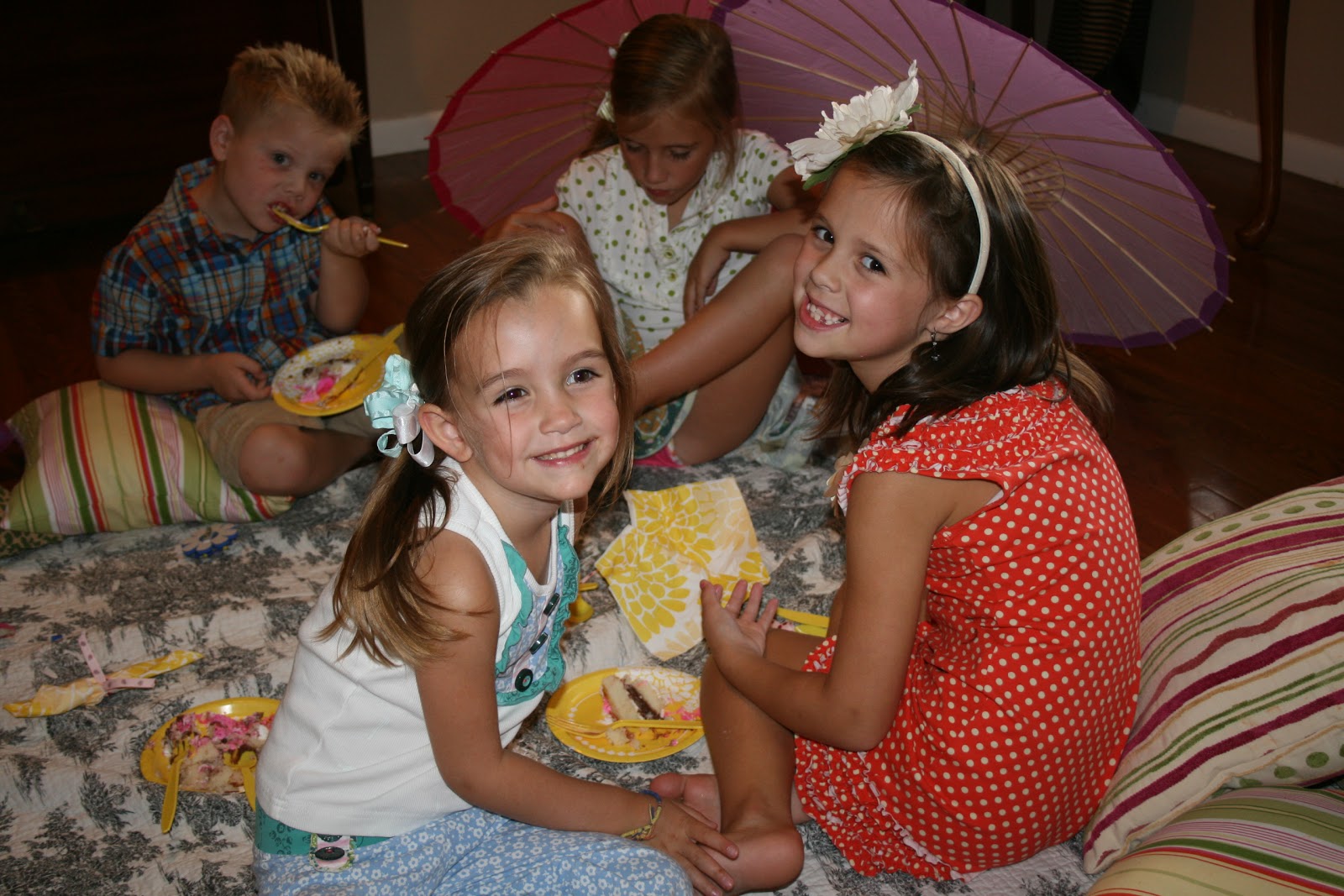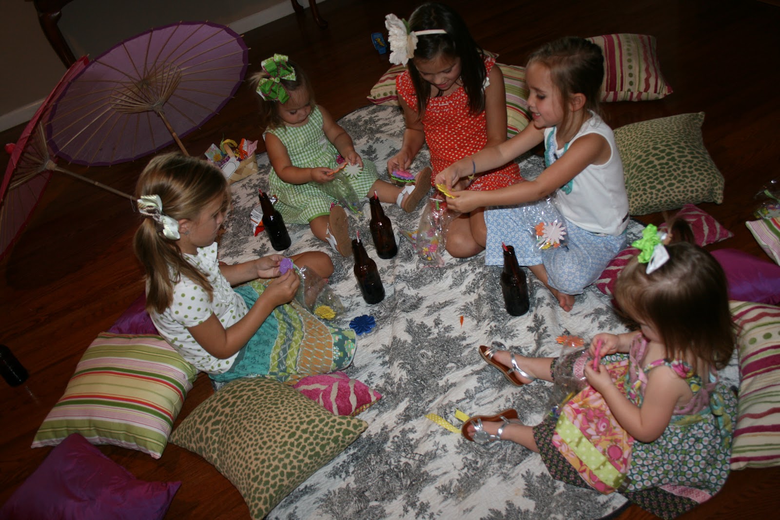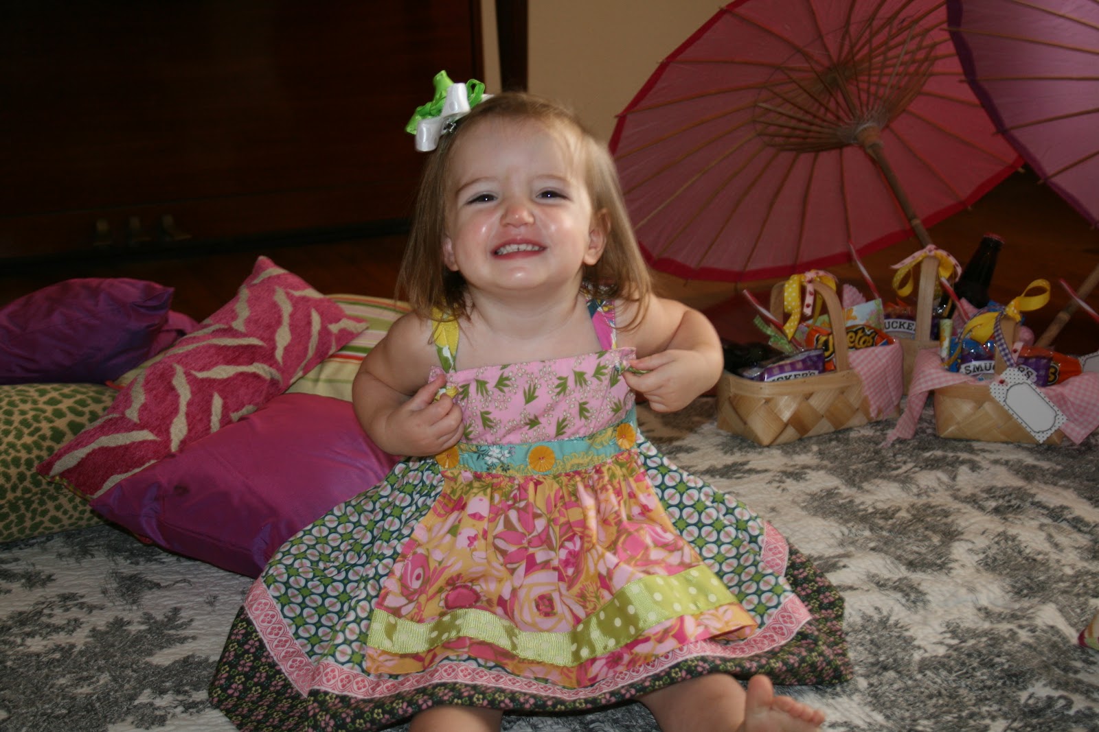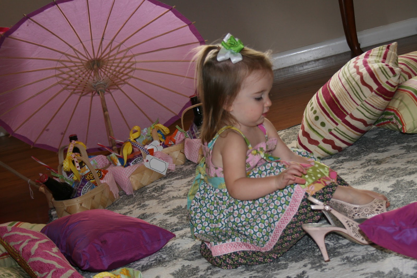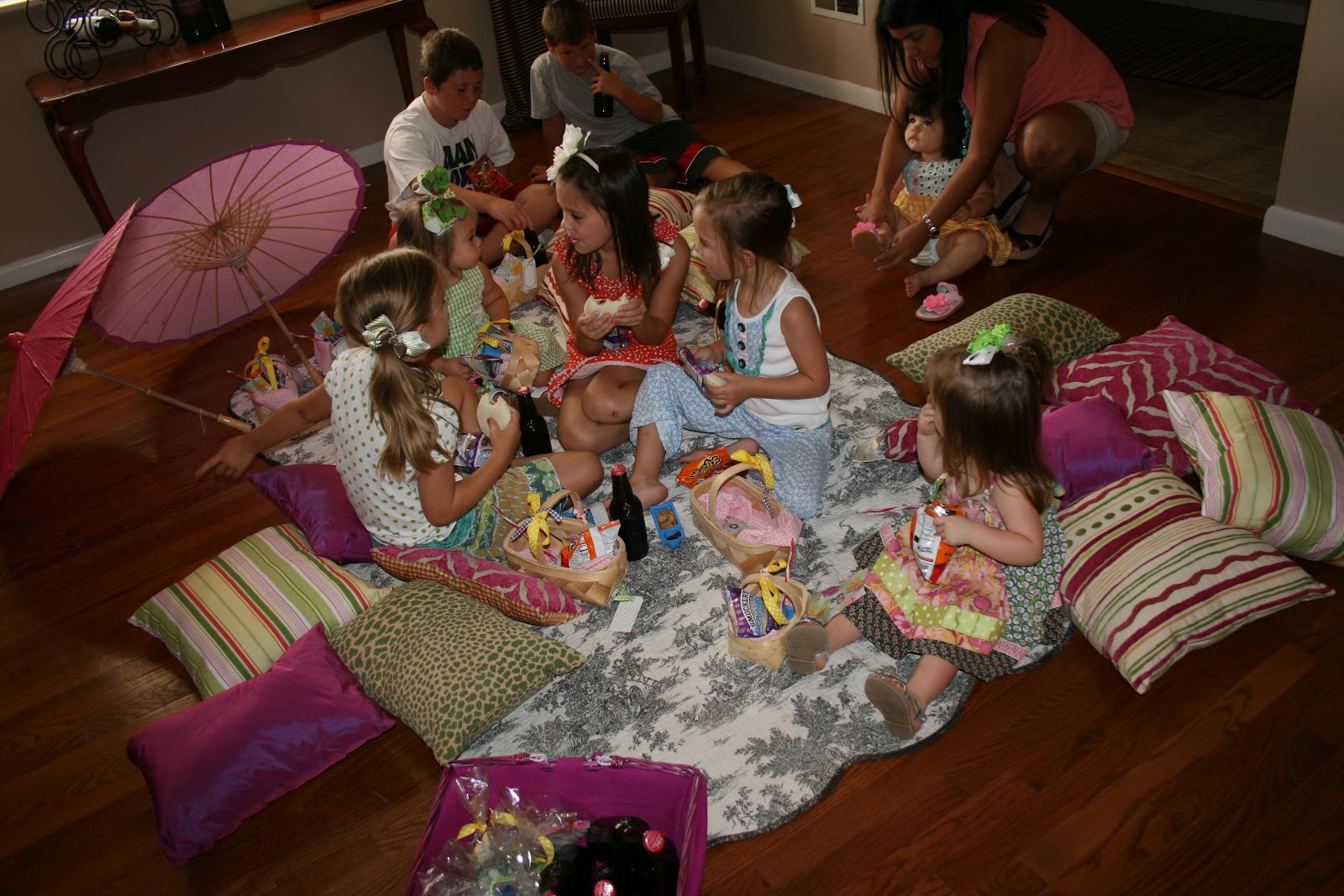Saturday I got up early and headed over to Boni’s to start decorating. I just LOVED this theme. Its hard to think of a theme for a younger child and even harder when its 100+ degrees outside! So the idea of an indoor picnic came to mind and I ran with it. I wanted the picnic to look like a lounge area. My mom makes pillows for every season, so it was a easy choice to use her summer ones. The colors screamed loungy summer. I then got some umbrellas and of course picnic baskets. I made picnic baskets for each child and used Catherine’s favorite foods, pb&j, cheetos, dunkaroos,and rootbeer. I then blew up blue and white balloons and put them above the picnic area to resemble the sky. It turned out soooo cute! Then it was time to decorate the cookie/lemonade table. I saw a CUTE picture online of a lemonade stand so I made a smaller version for this table. It was so easy to put together and so adorable. I baked cookies on a stick and them placed them on top of chocolate and sprinkle rimmed glasses of milk. I also had three baskets of goodies on the table. I found adorable picket fence pieces, picnic chairs and a tiny puppy(Catherine LOVES puppys) and used them for decoration as well. The colors were just so so perfect. I loved how it turned out. After the kiddos ate their lunches, I had flower pin making kits for each kid to make. They loved putting them together. The party was so much fun and Catherine was smiling the entire time. Here are TONS of pics : )