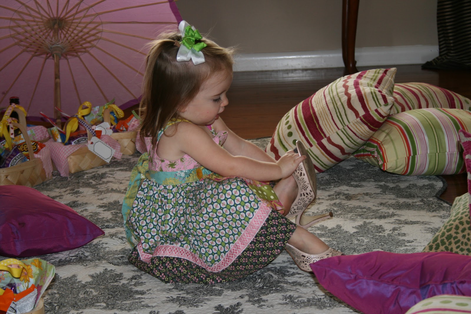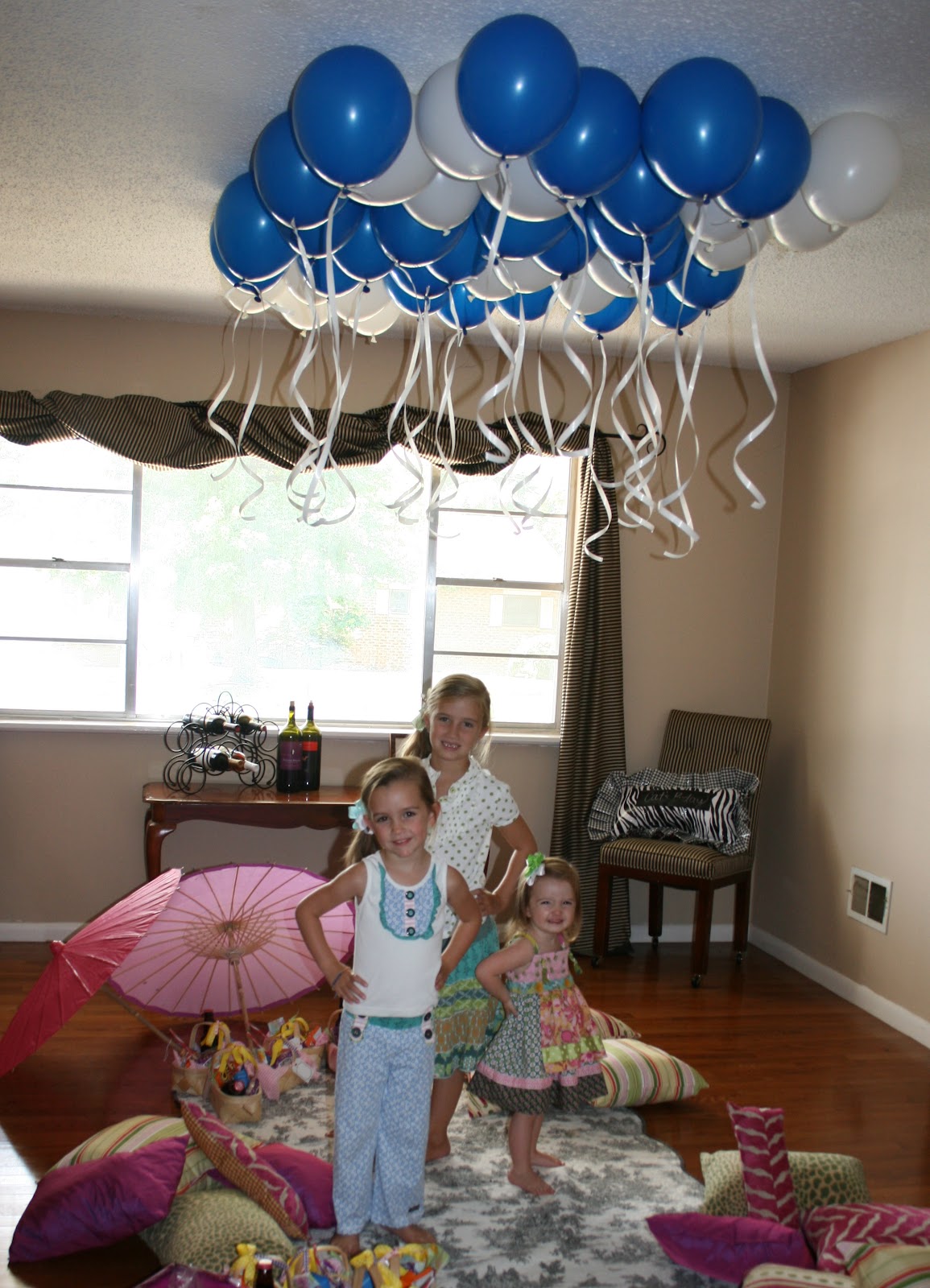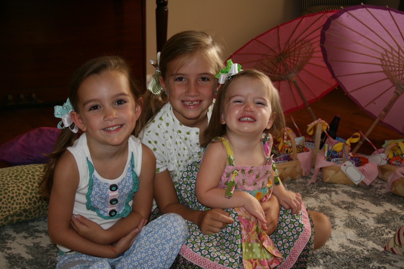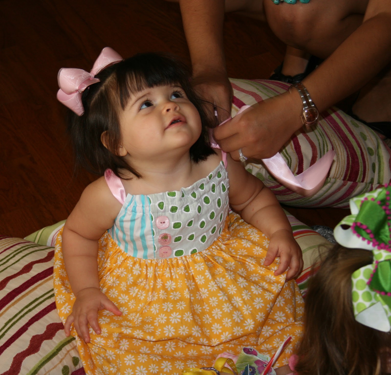 Saturday I got up early and headed over to Boni’s to start decorating. I just LOVED this theme. Its hard to think of a theme for a younger child and even harder when its 100+ degrees outside! So the idea of an indoor picnic came to mind and I ran with it. I wanted the picnic to look like a lounge area. My mom makes pillows for every season, so it was a easy choice to use her summer ones. The colors screamed loungy summer. I then got some umbrellas and of course picnic baskets. I made picnic baskets for each child and used Catherine’s favorite foods, pb&j, cheetos, dunkaroos,and rootbeer. I then blew up blue and white balloons and put them above the picnic area to resemble the sky. It turned out soooo cute! Then it was time to decorate the cookie/lemonade table. I saw a CUTE picture online of a lemonade stand so I made a smaller version for this table. It was so easy to put together and so adorable. I baked cookies on a stick and them placed them on top of chocolate and sprinkle rimmed glasses of milk. I also had three baskets of goodies on the table. I found adorable picket fence pieces, picnic chairs and a tiny puppy(Catherine LOVES puppys) and used them for decoration as well. The colors were just so so perfect. I loved how it turned out. After the kiddos ate their lunches, I had flower pin making kits for each kid to make. They loved putting them together. The party was so much fun and Catherine was smiling the entire time. Here are TONS of pics : )