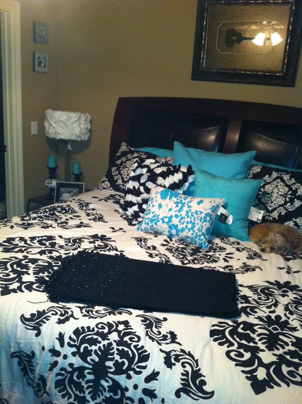 I have been busy working on our master bedroom. I have started collecting pillows and such and its coming together quite nicely! I LOVE the tiffanish blue. I still havent decided what kind of picture I want over the bed, so ignore the big key picture haha. The opposite wall is going to be covered in lots of black and white pictures, and I have already began that project. Dont you love the lamp too! so cute!