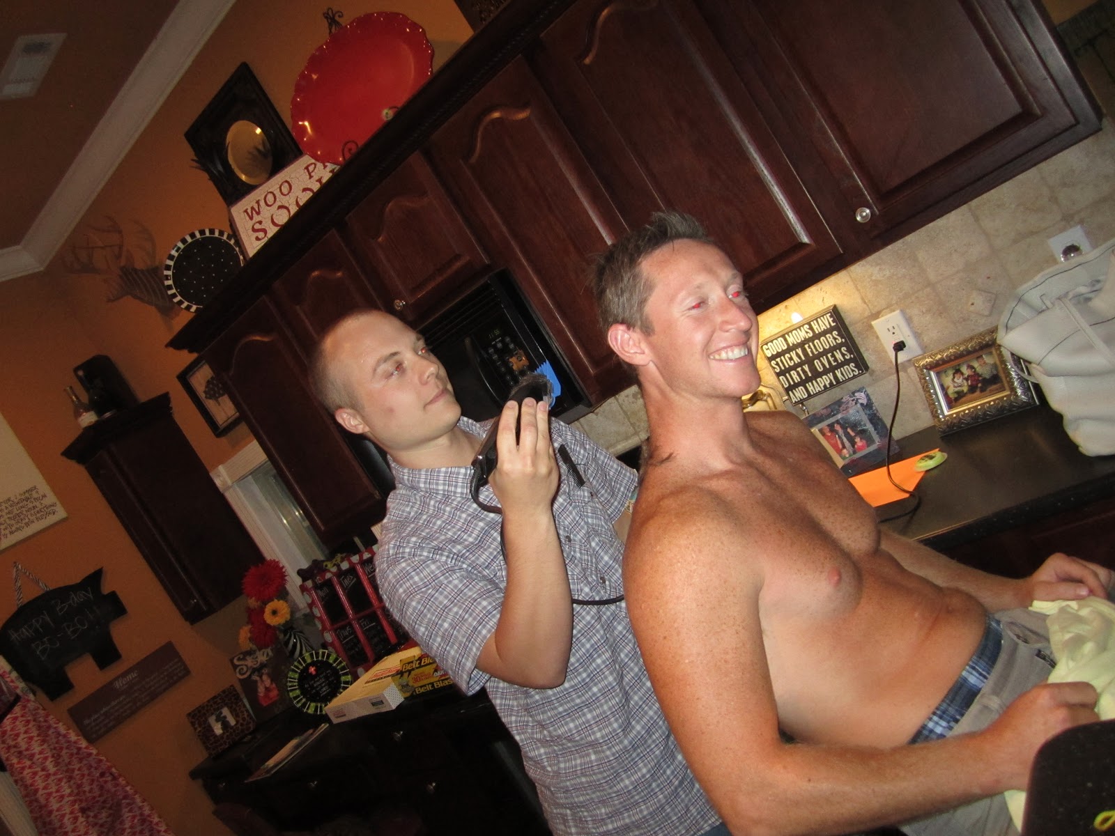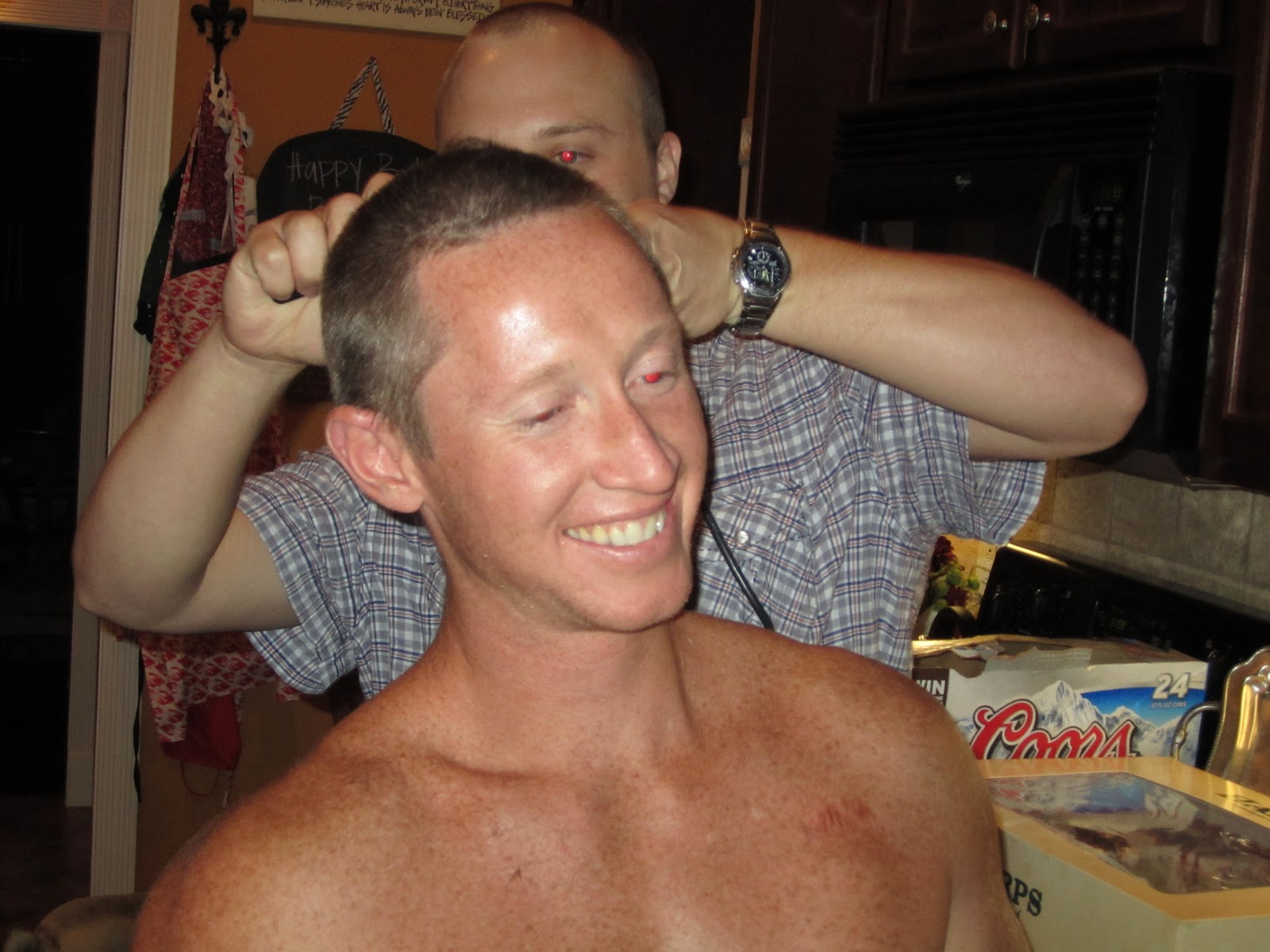 After the wedding we headed back to my sisters to pick up sadie jane. Then things got kinda funny. Drew has been wanting to shave his head for sometime. He just has never gotten the nerve to do so. I have always loved a shaved head so I didnt mind. Well that night Drew asked Shane to shave his head. As soon as Drew asked, Shane wasnt going to let Drew back down haha. He went right after his head lol. We were all laughing and Drew still giggles at himeself. I think he look spretty darn handsome.