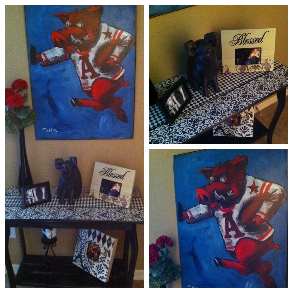 I have been picking up things for the house over the past couple of months. When I saw this damask table and the end table at RiffRaff, I HAD to have them : ) Then friday night, my dad got me this awesome hog painting at the silent auction. We had a bidding war going haha. I wasnt leaving without it. It resides in our entryway right now since its football season! : )