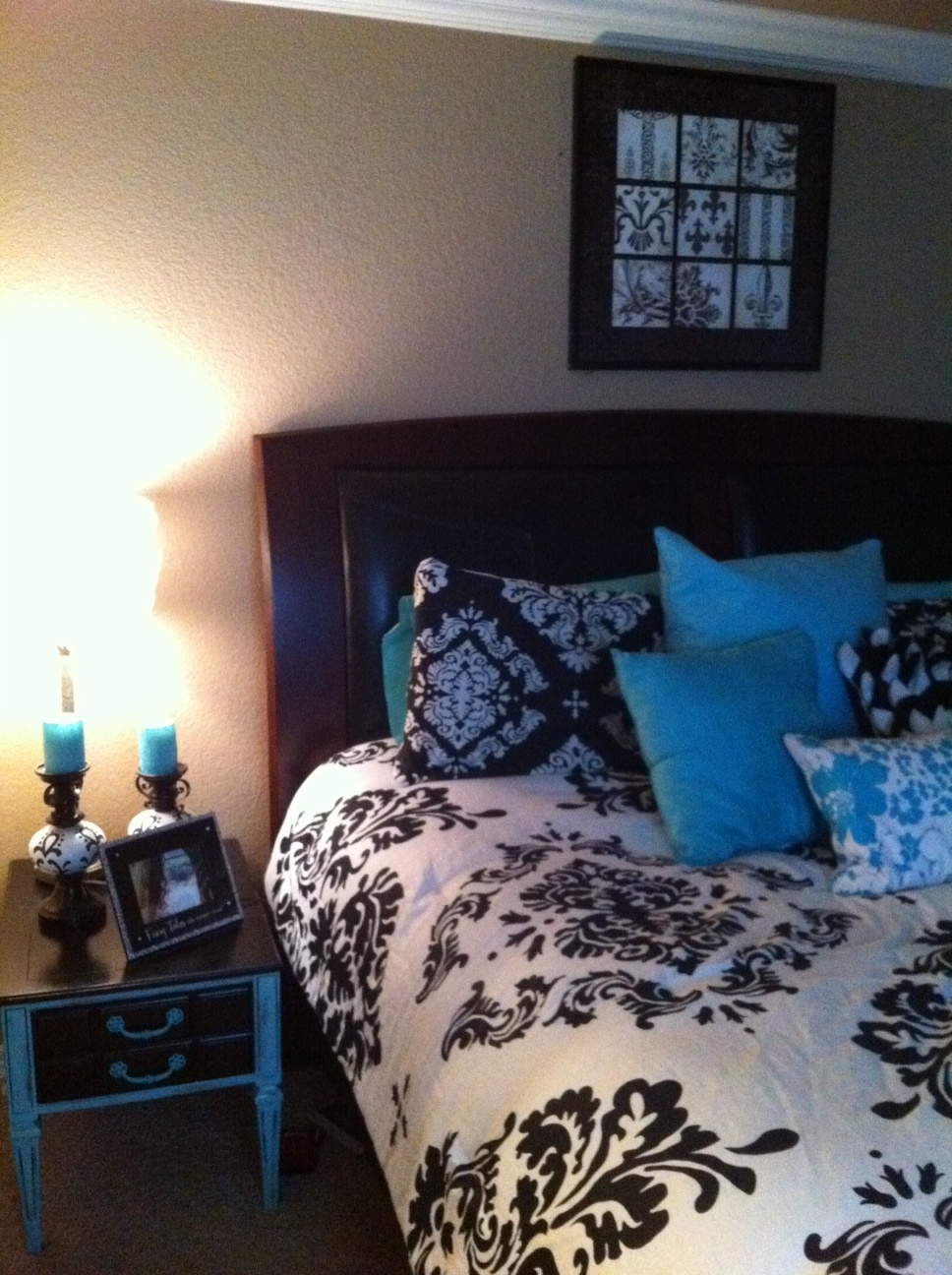 The end table matched our master PERFECTLY. I finally found a picture to put above the bed as well over the weekend. Thinking I may add some candleholders on both sides, not sure yet. But I am loving how everything is coming together!