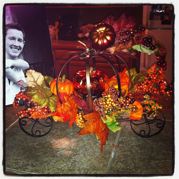 I decorated a little for the fall in the house too this weekend. I found this carriage at TJ Max and had to have it! I added the leaves, and pumpkins. Love!