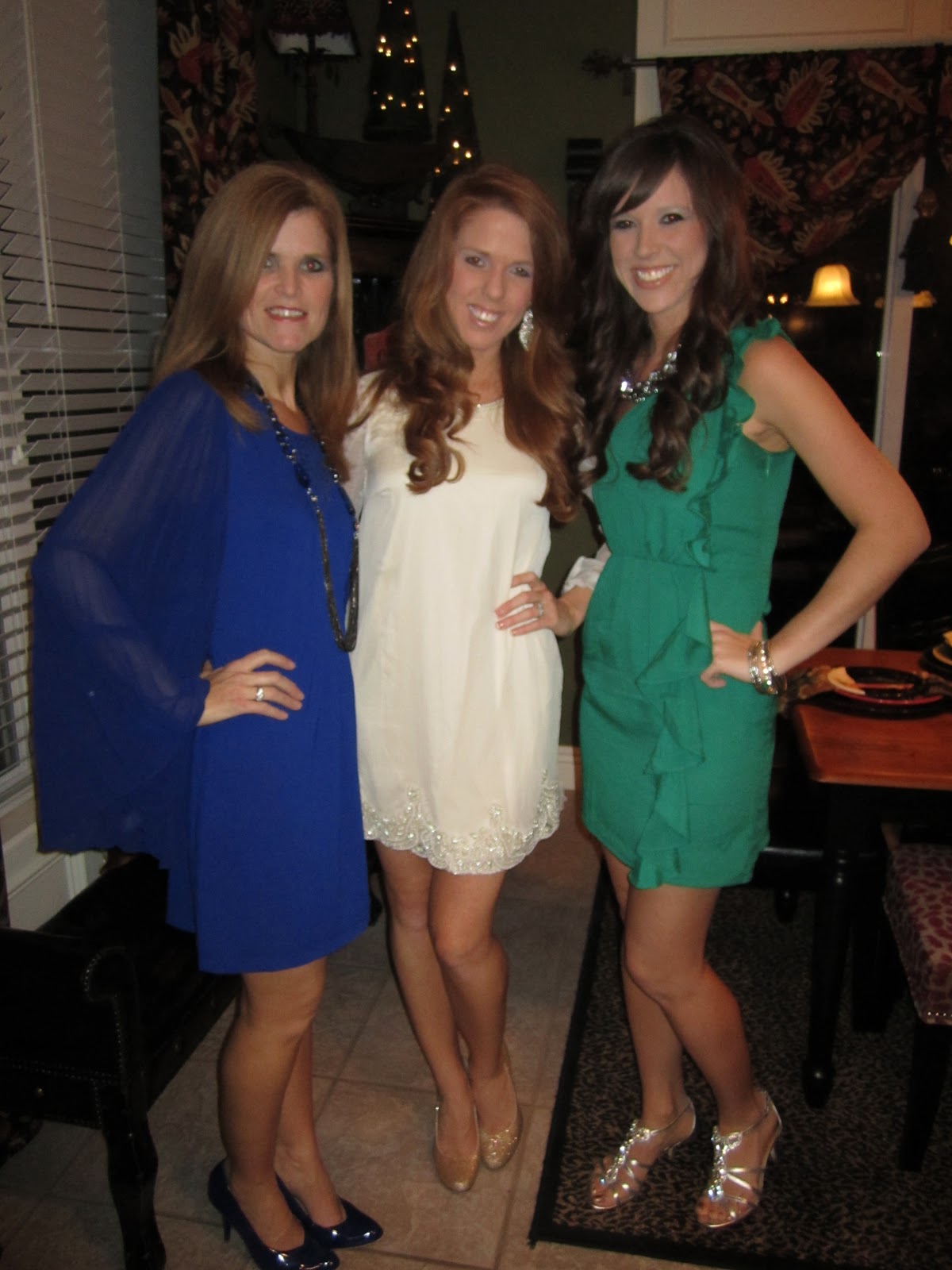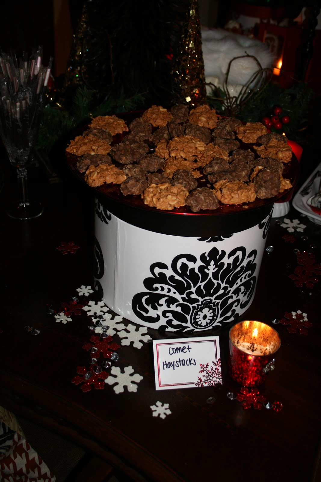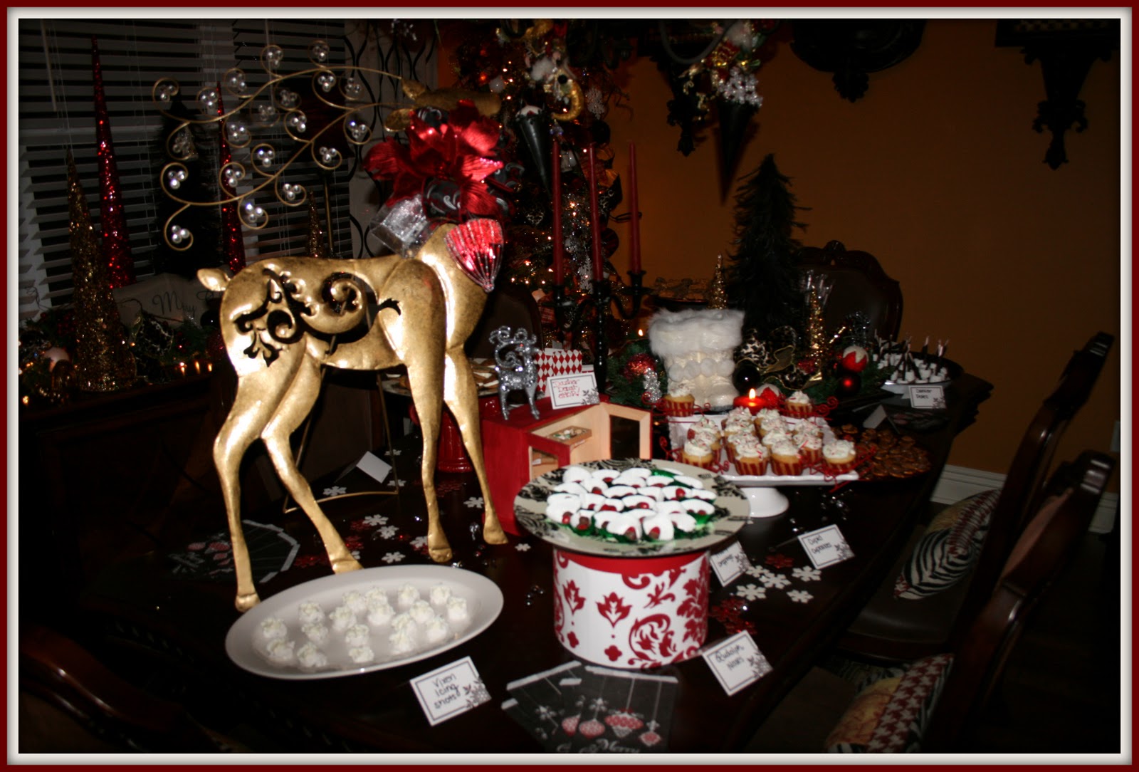 THEN it was time to put the last minute touches on the Christmas Party! Every year I do a Christmas Vixens party with my friends. This year we wanted to include the boys so we did Christmas Vixens and Blitzens. I stayed up till midnight baking up a storm with my mom and sister. We did a dessert table that was reindeer theamed. Each reindeer had their own dessert! : ) I saw on pinterest a couple weeks ago mini doughnuts made from cheerios, so I made Dasher’s donut shot! It turned out precious. Then we made Prancer Pretzels, Cupid Cupcakes, Vixen Icing Bites, Dancer Poles(haha), Blitzen Shots and Truffles, Comet Haystacks, and Donner Doozies. It turned our gorgeous and was delicious! We hired Jayme to cater the event and let me tell you.. her food is amazing! I cant even tell you how awesome it was to have her do the food and not be standing in front of a stove for hours before the party! She made so many delicious things and the guests RAVED about her food. THANK YOU JAYME! For the gift exchange we did Cocktail rings and the boys brought liquor. The party went just perfect and everyone looked absolutely GORGEOUS! I jsut love this time of year!