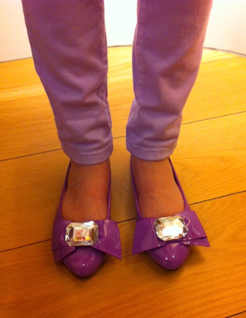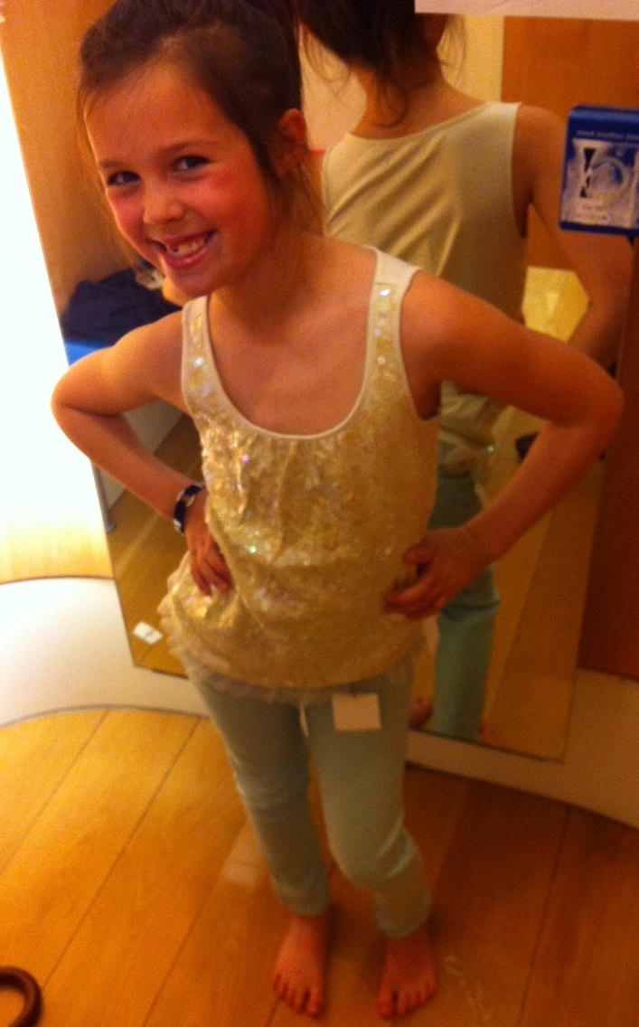 Our first stop was Gap. OMG the clothes were adorable there. Colored Jeans galore! We immediately snatched up every color they had in her size and then found a couple cute tops. We had to throw in a sequin tank too. Claire even picked up a skirt and handed it to me and said this looks like you. Low and behold, it fit and is seriously ADORABLE. Yes I am not ashamed to buy something from Kids Gap. Claire found these flats that were so flipping cute. Here is the little fashionista i snapped with my iphone in her new clothes