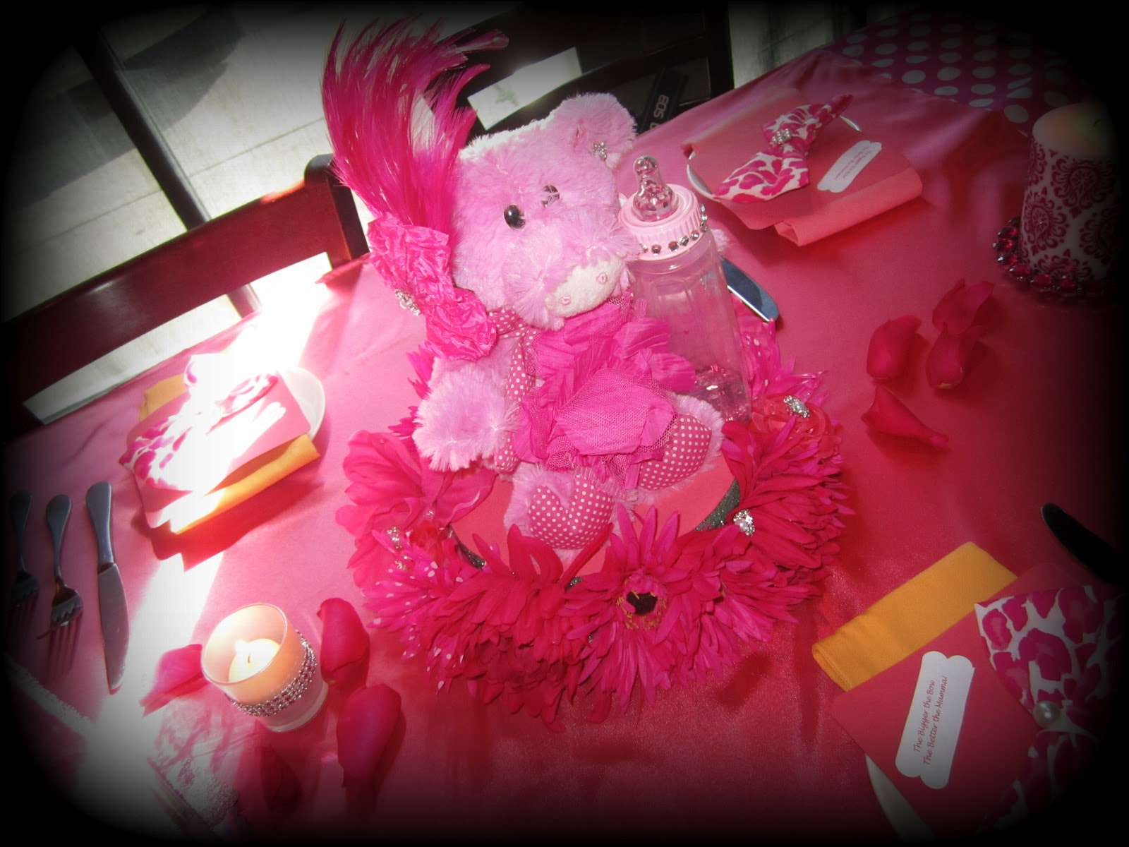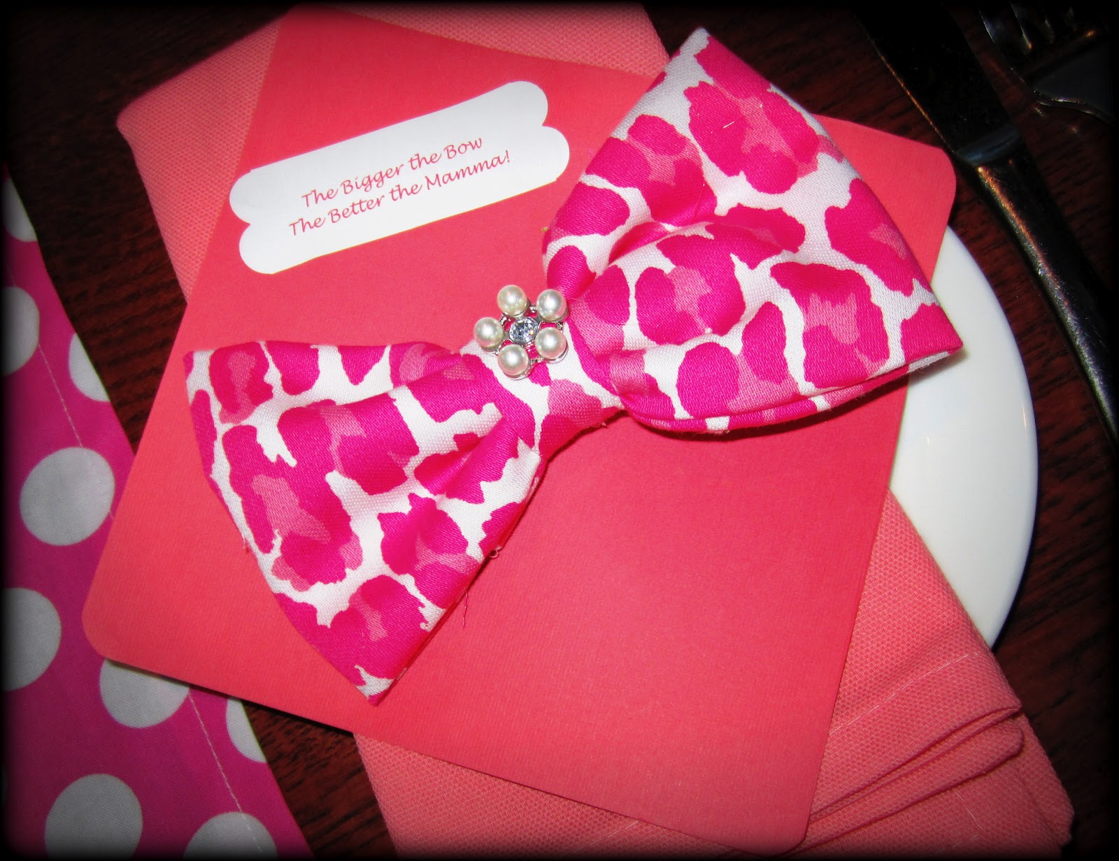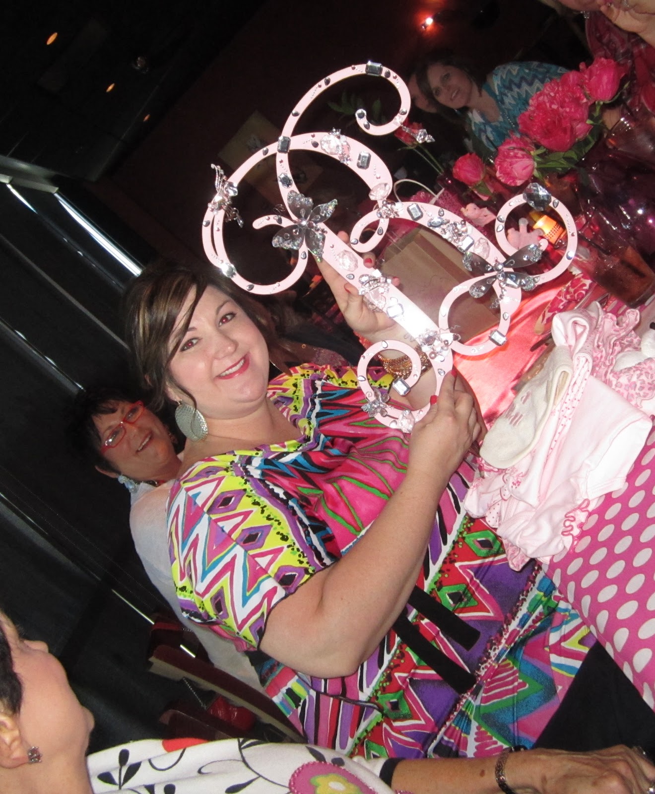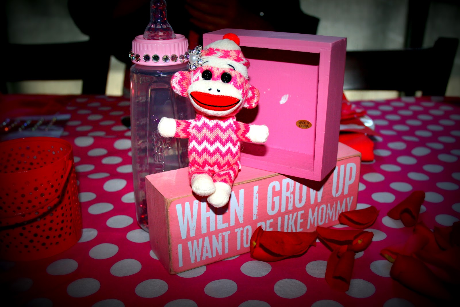 Friday night I spent the night getting things ready for Kristen’s baby shower. I helped put together the decor for the shower and it turned out super cute. The theme was super girly with pink and coral as the main colors. My sister saw a cute idea online where they used stuffed animals as decor. We picked up some super cute animals and I blinged them out. It was adorable. We got really lucky and found some mini sock monkeys that were pink and coral chevron, which matched the invite. I added a bling headband to those too : ) I immediately thought of the favor, big bows with “the bigger the bow, the better the mama” on the cards and my talented mom made them. They were a huge hit. She also made the pretty table cloth. We blinged out some bottles and had everyone write a blessing for the sweet baby girl. My sister set up an american girl doll party for the little girls. It was SO cute!