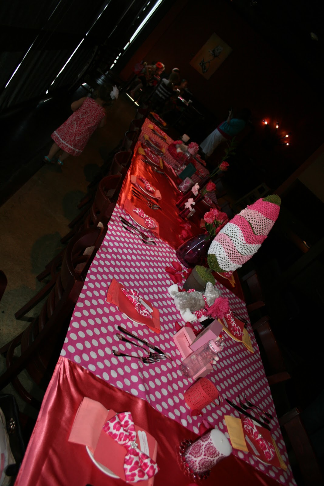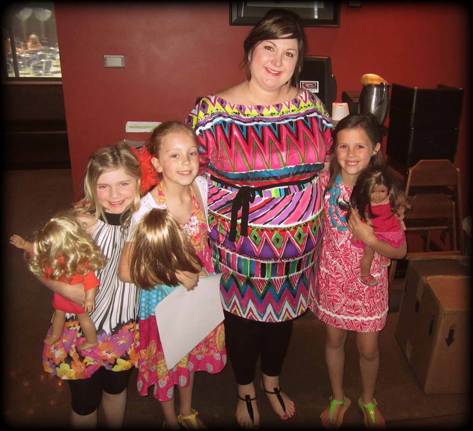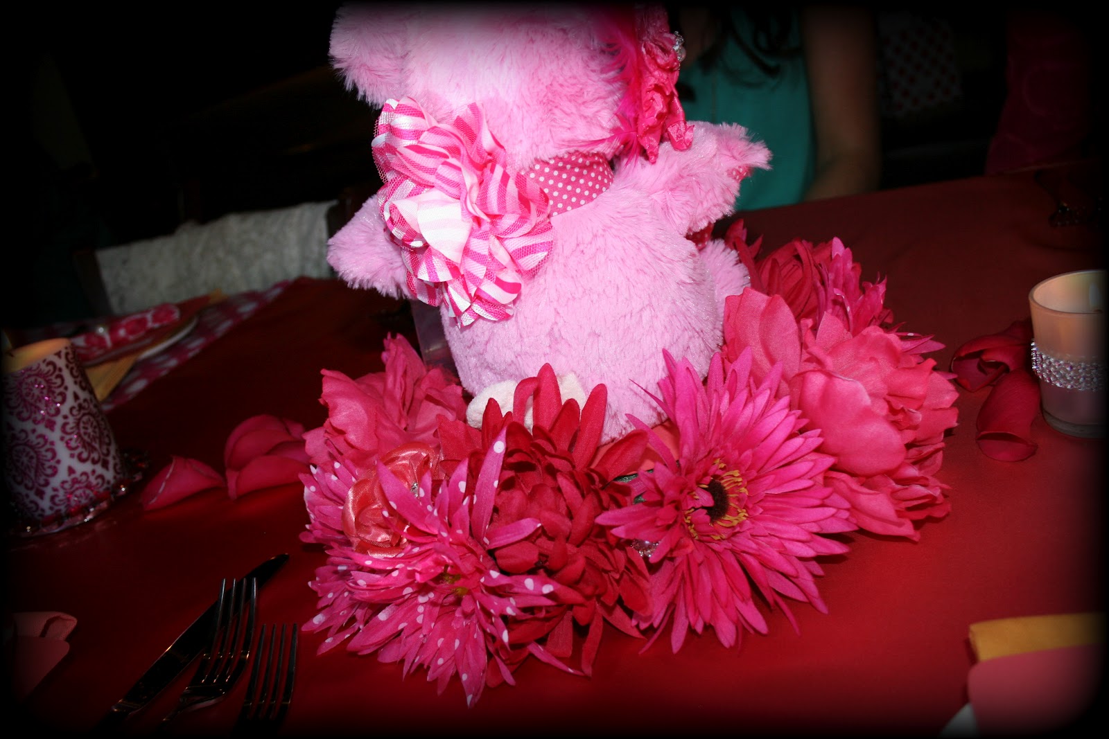 Friday night I spent the night getting things ready for Kristen’s baby shower. I helped put together the decor for the shower and it turned out super cute. The theme was super girly with pink and coral as the main colors. My sister saw a cute idea online where they used stuffed animals as decor. We picked up some super cute animals and I blinged them out. It was adorable. We got really lucky and found some mini sock monkeys that were pink and coral chevron, which matched the invite. I added a bling headband to those too : ) I immediately thought of the favor, big bows with “the bigger the bow, the better the mama” on the cards and my talented mom made them. They were a huge hit. She also made the pretty table cloth. We blinged out some bottles and had everyone write a blessing for the sweet baby girl. My sister set up an american girl doll party for the little girls. It was SO cute!
