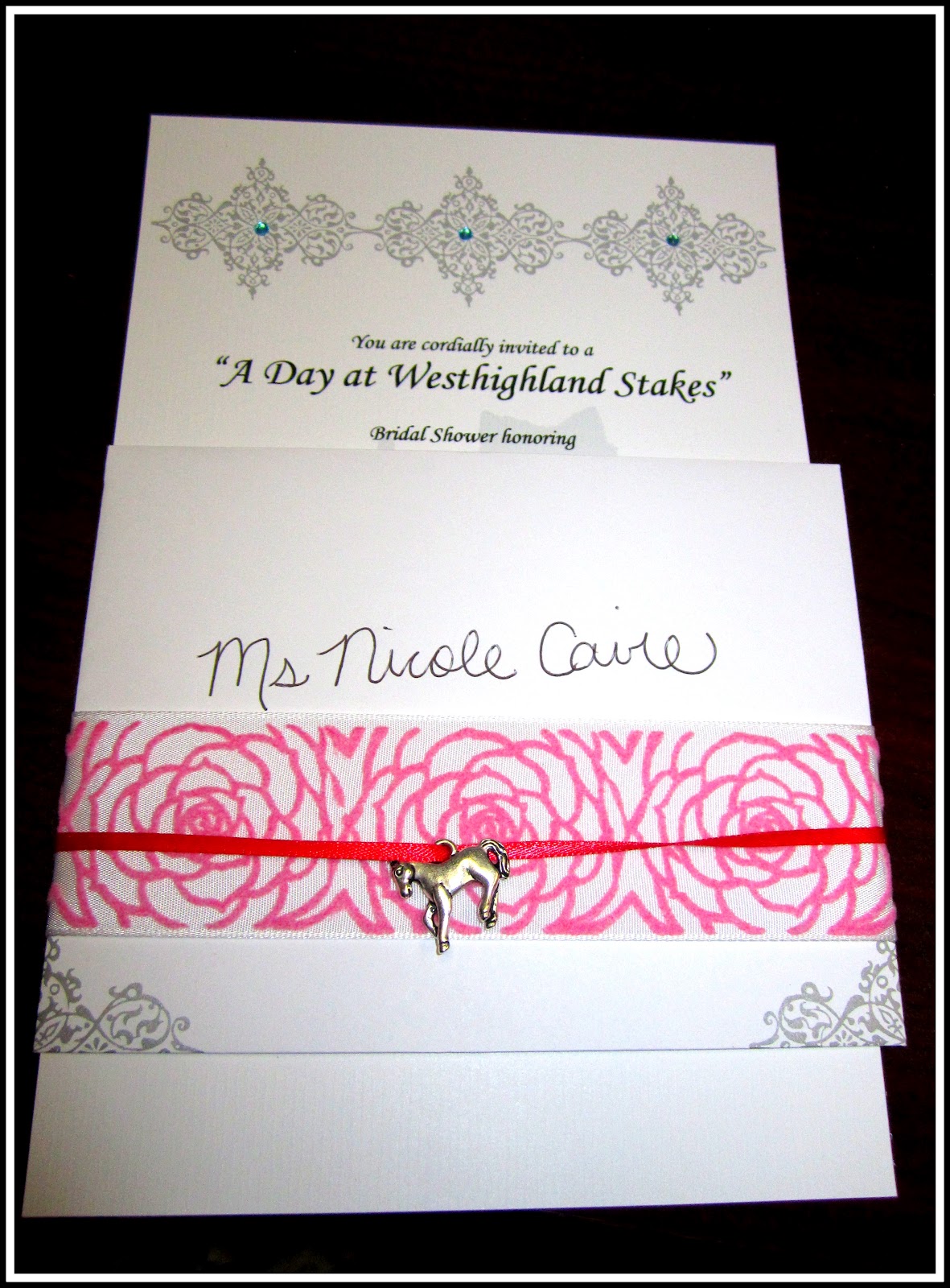 I bought an invitaiton kit at Hobby Lobby and jazzed them up. We wanted something formal and southern. I got the ribbon from hobby lobby as well and the horse charms from Artbeads.com. I designed the invitations and printed them myself. I think they turned out super cute and I cant wait to share all the fun details of the shower very soon!!