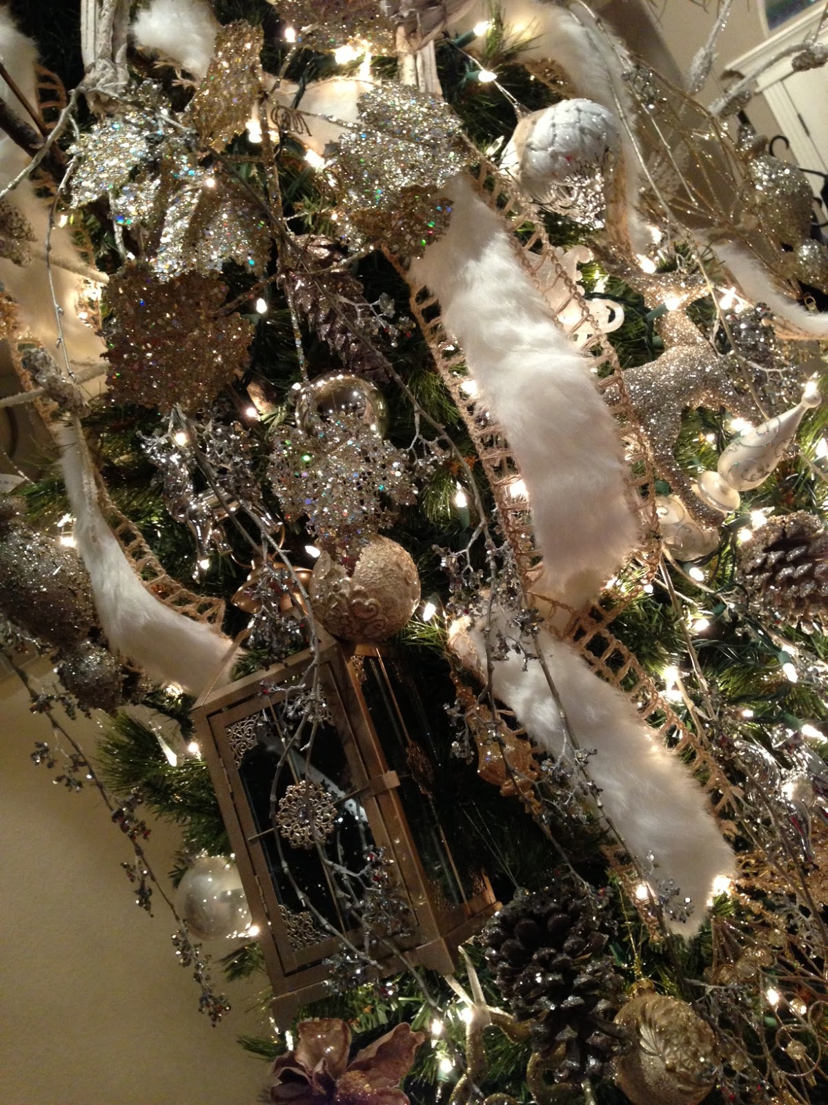 Step Four- Ornaments- I start with my favorites and then end with Regular Christmas balls. I place my favorites where they can be seen and then fill with the balls. I hang ornaments off the picks from the topper too. Be sure to step back and access and make sure you disperse the lighter ornaments thru out the tree. Also do not forget the sides!