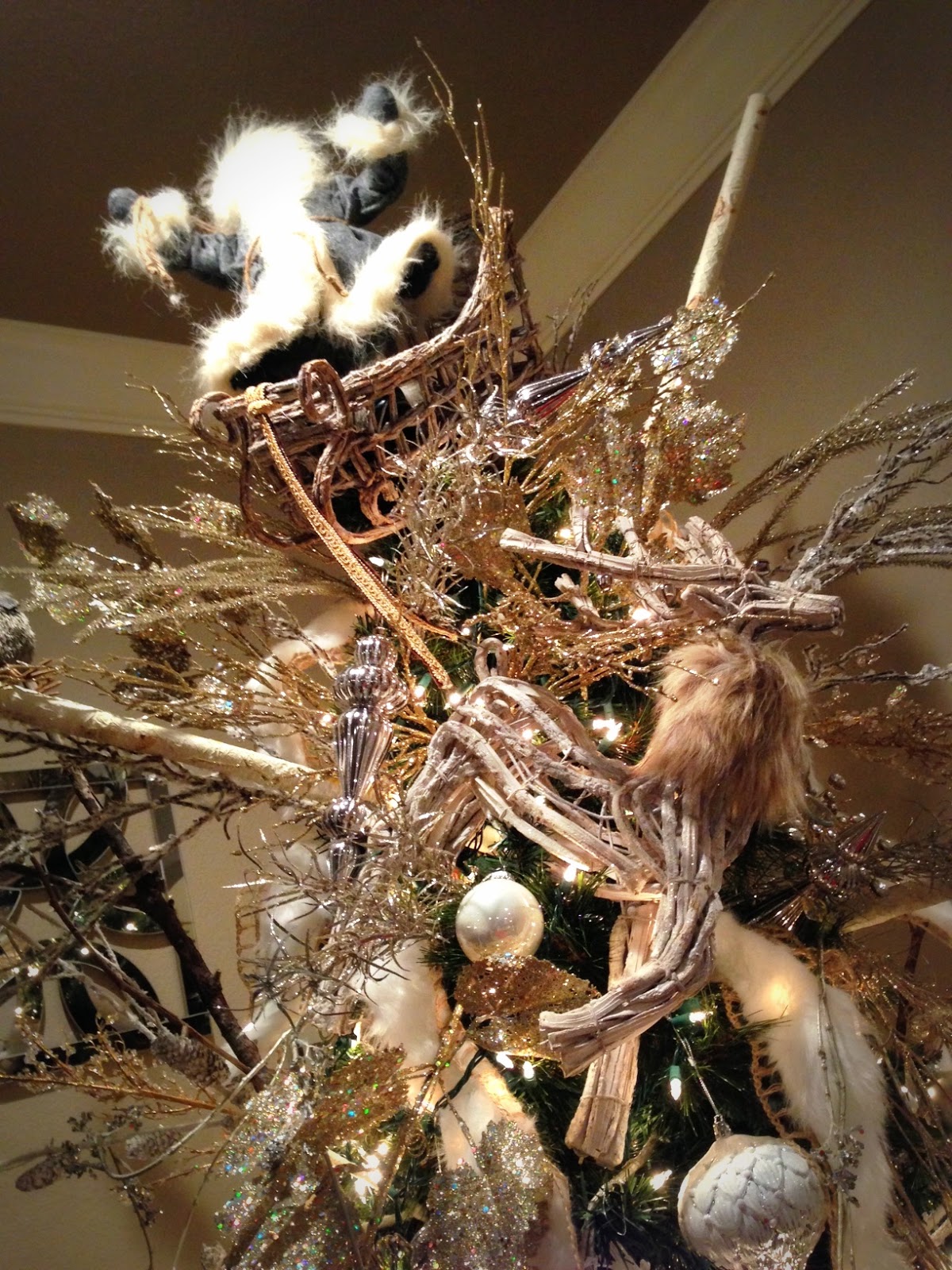 Step One- The Tree Topper- I always start with the top since I am practically man handling the tree putting all my picks and sticks in. This year I found a GORGEOUS sleigh and reindeer (thanks Sign Sealed and Delivered!) for the centerpiece of my topper and then my mom found me the most perfect Santa for the sleigh. After placing your main centerpiece, start putting in your picks. Do not try to be perfect and fill every nook and cranny. You can add depth with ornaments later. Also get creative! My mom and I went out to the trees by my house and got real tree branches for our toppers. I SO wish I took pictures of our excursion. It was hilarious!