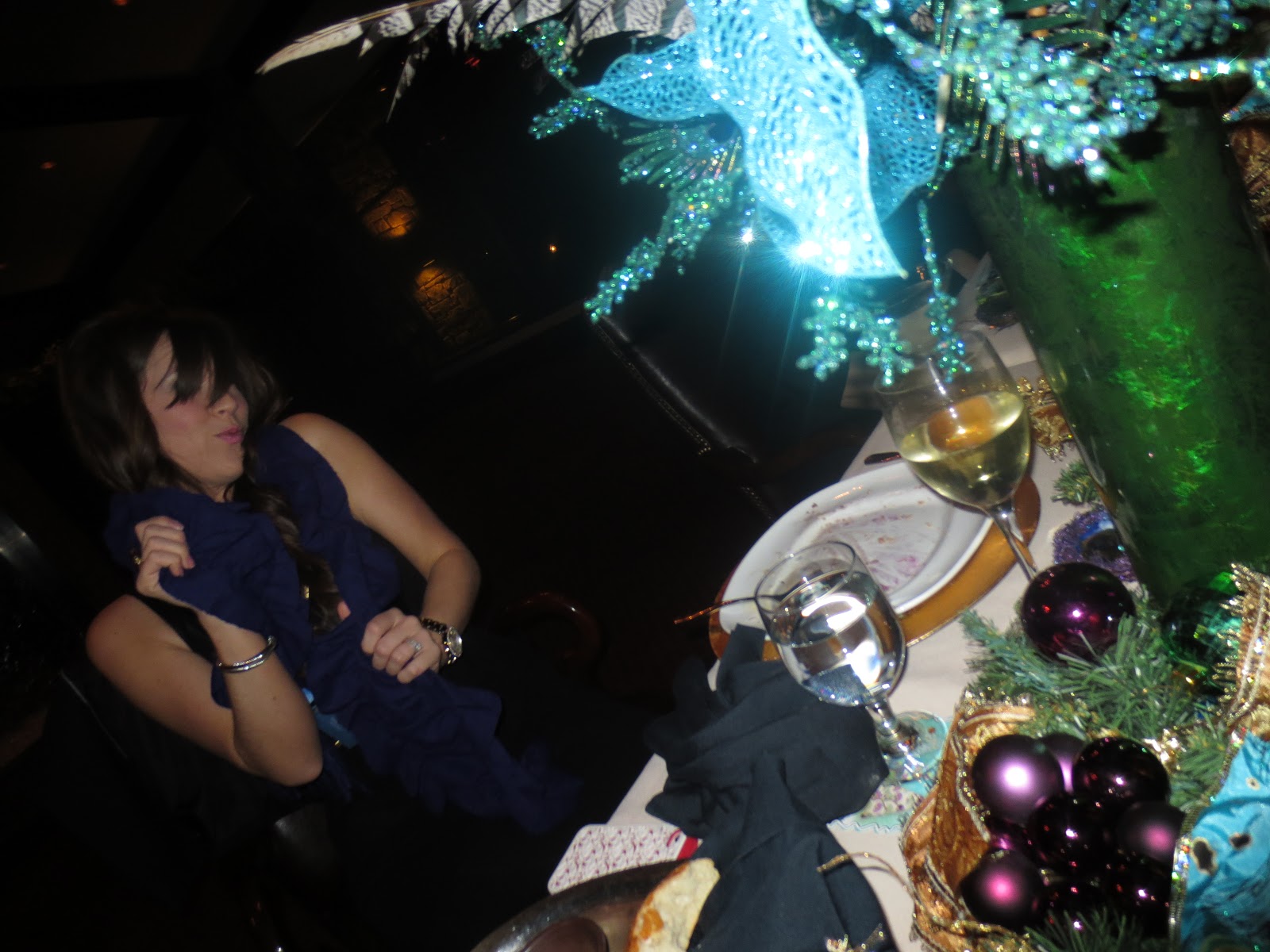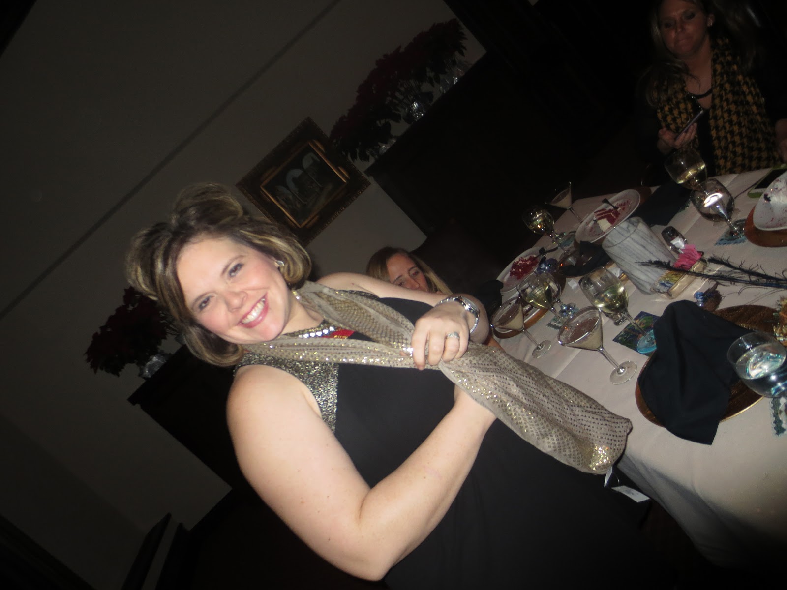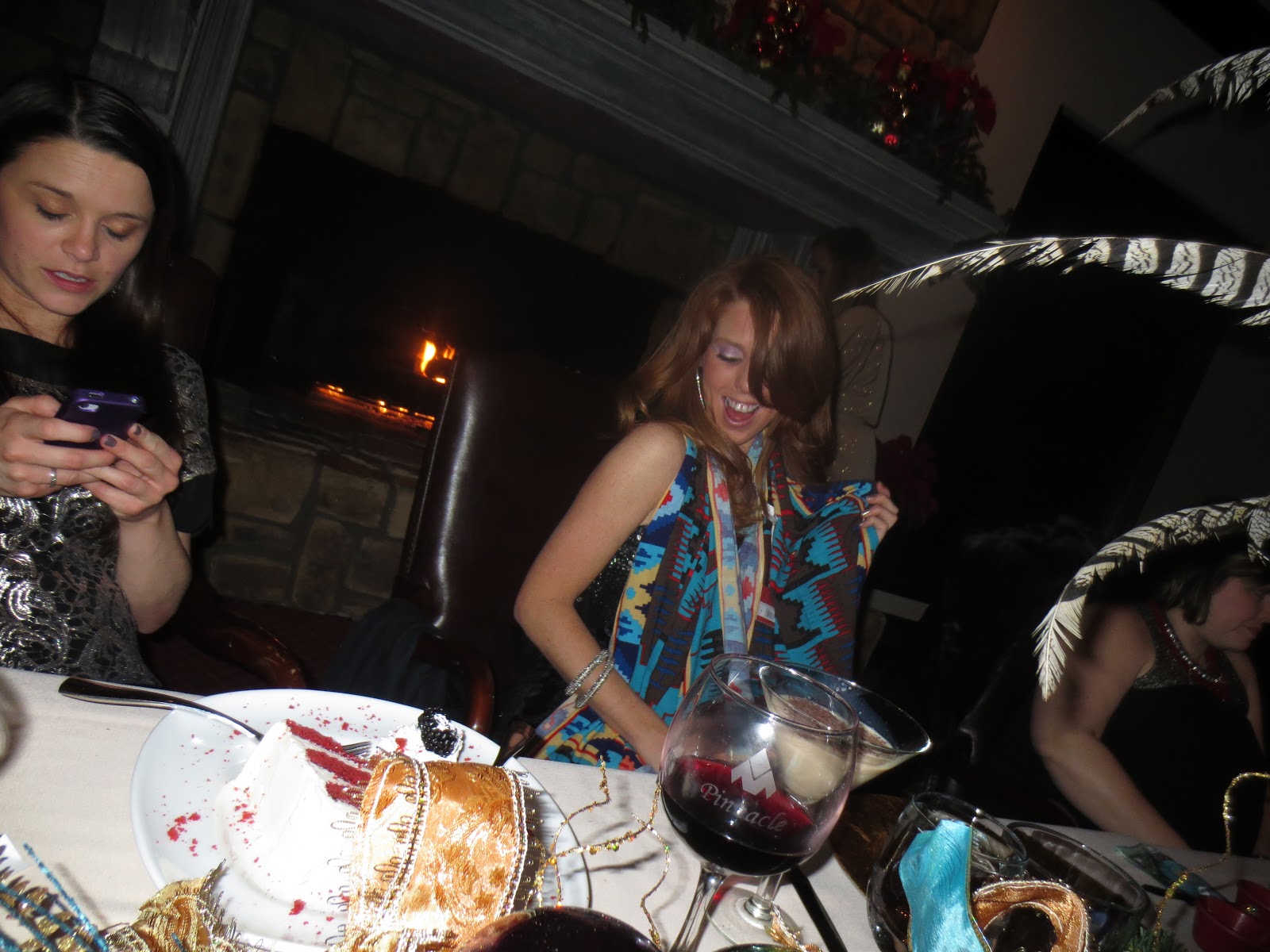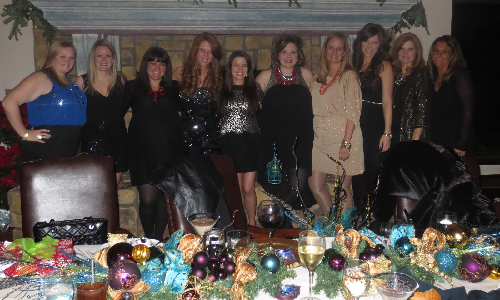 This year it was at pinnacle country club and I did a peacock theme. Each year I give the girls an ornament, so I made fancy birds nests with baby peacocks on them. They turned out pretty fabulous! I decorated the table with my moms help! (thank goodness for her! The party was the same day they photographed my home for the magazine!) Everyone came to my house for dessert and a cocktails before the party. Who says you cant eat dessert first? 😉 Also we have a themed gift exchange for anyone that wants to participate and this year we did scarves. We had so much fun sitting by the fire eating wonderful food and drinking fantastic wine. We were missing a few ladies, but we had a wonderful relaxing night.