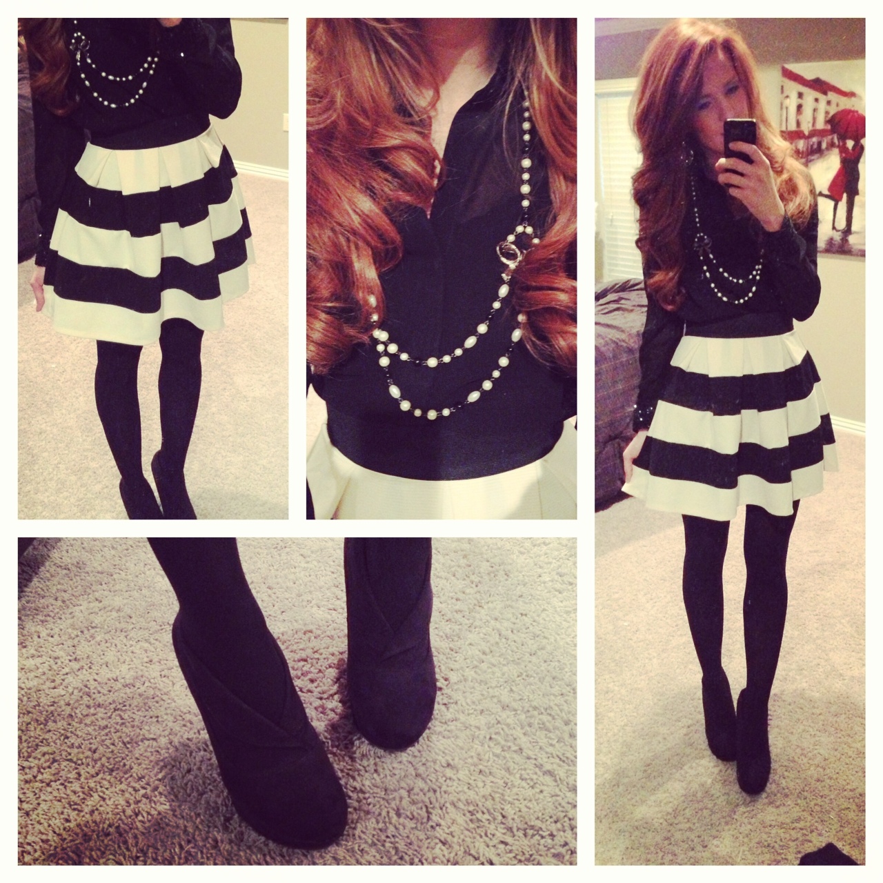 I purchased an adorable black and white striped skirt from Belle boutique for the Arkansas Derby in March I decided I couldn’t wait that long to wear it, surprise surprise : ) Today I styled it today with black tights, a black button up shirt with sequin accents and my black target booties.