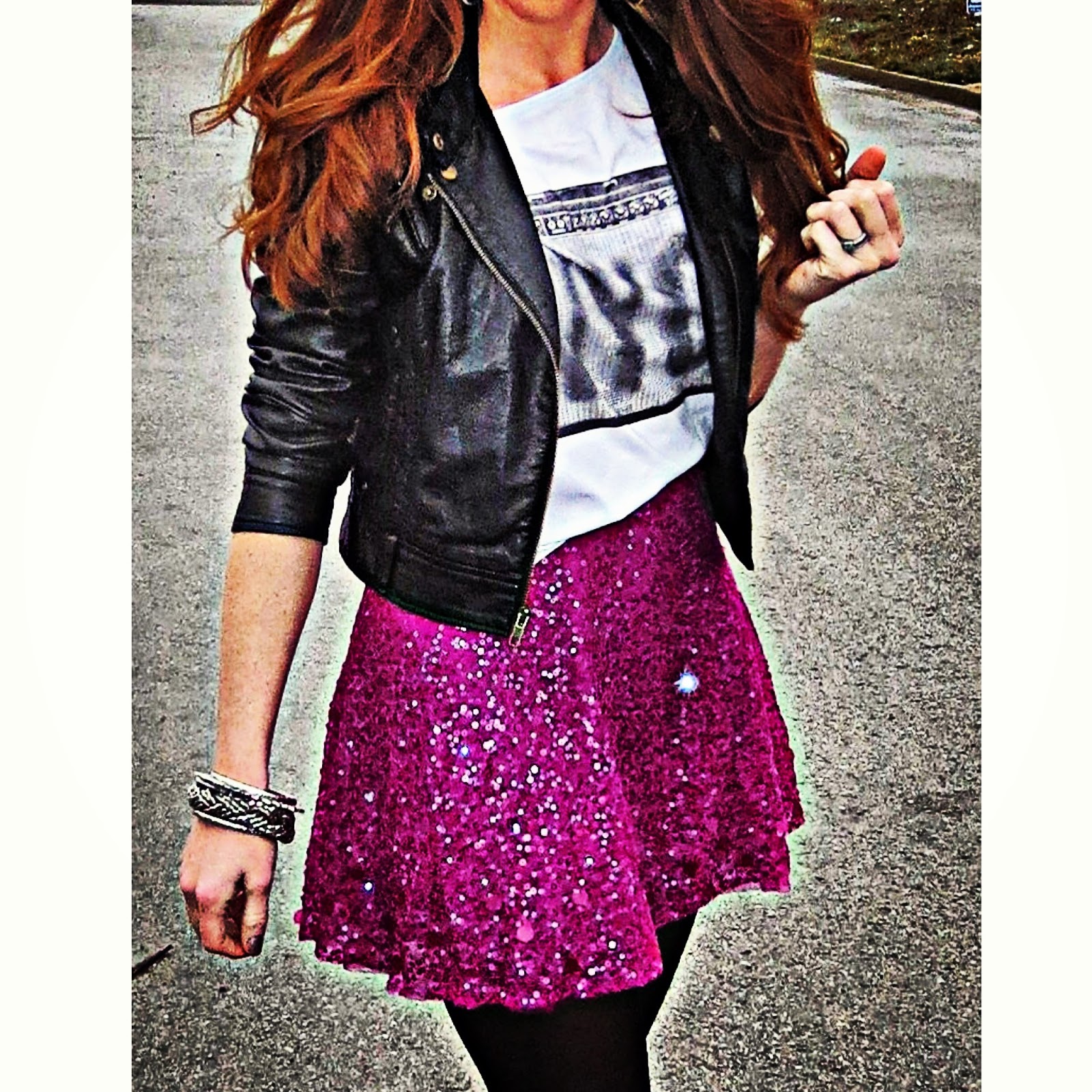 I paired the NYC Chaser Tee with a Gap Sequin skirt and a Lauren Conrad Leather Jacket. The sequins make the t shirt insta glam and the jacket gives its that “NYC feel”.