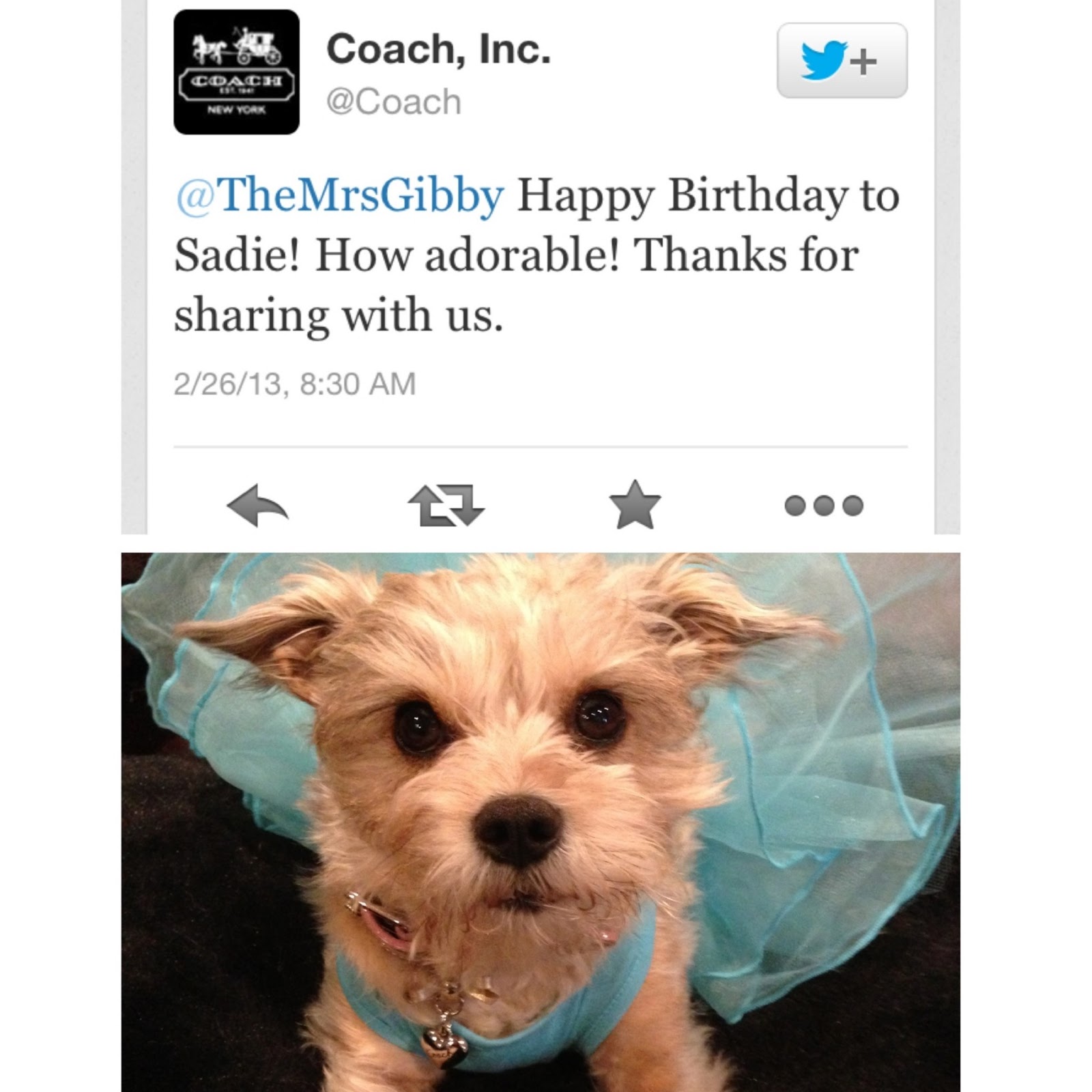 Today is Miss Sadie Jane’s 6th Bithday! We got her a Coach collar for her birthday and Sadie got a pretty fabulous Birthday Wish from Coach themselves! We love our little fur child and she is having a doggy bday tonight with her favorite furry friends.