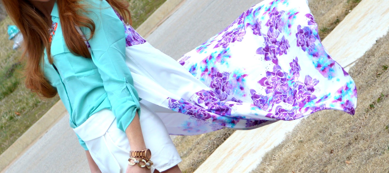 Needless to say I had a lot of fun picking out my NWAFW outfits this year. I searched from country to country… literally! When I spotted this Sabo Skirt cape on instagram, I knew I had to have it for fashion week. This piece is simply gorgeous. The colors are stunning together and it moves beautifully. I paired it with a pair of super chic shorts from Zara. The pointed hem is hem on the shorts is so unique and the quality is fantastic. I then topped it off with a mint/turquoise button down from Savoir Faire. I decided to add a pop of color with an H&M orange necklace which happened to match my new nail color. 😉