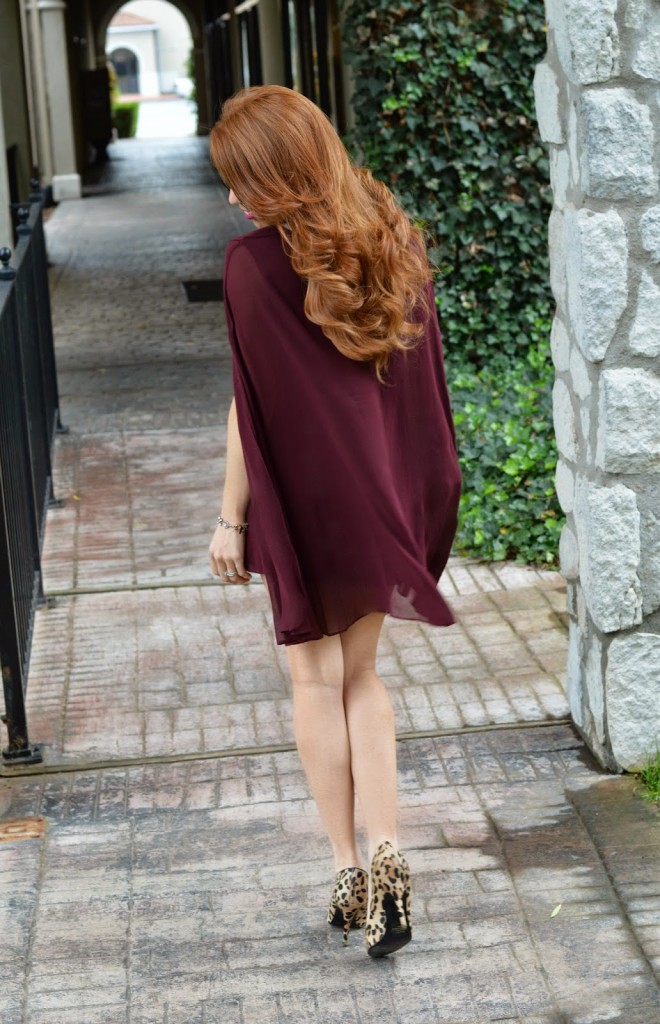 This dress features a swath of fabric that drapes over the shoulders like a built in cape. I feel like I do have superpowers being a mom, so hey I say it fits the bill. All joking aside, this dress is stunning. The color is striking and the shift silhouette is super flattering. If the shorter hemline is not your cup of tea, I think it would look great with a pair of leather leggings.