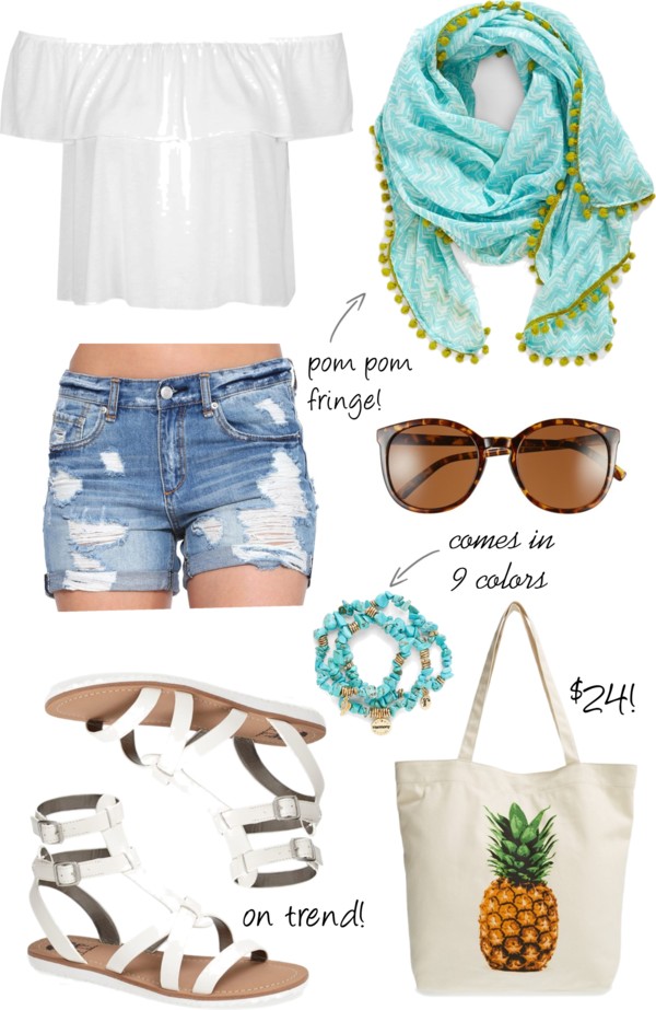 Today I am sharing one of my go to looks for the spring/summer time months! How adorable is that pineapple tote? It is perfect to take to farmers market or to the beach! Y’all know I am obsessed with anything off the shoulder and this top is perfection (and comes in multiple colors!) I have gotten a lot of emails asking for budget friendly shorts to the Rag and Bone pair, and these are pretty darn close!