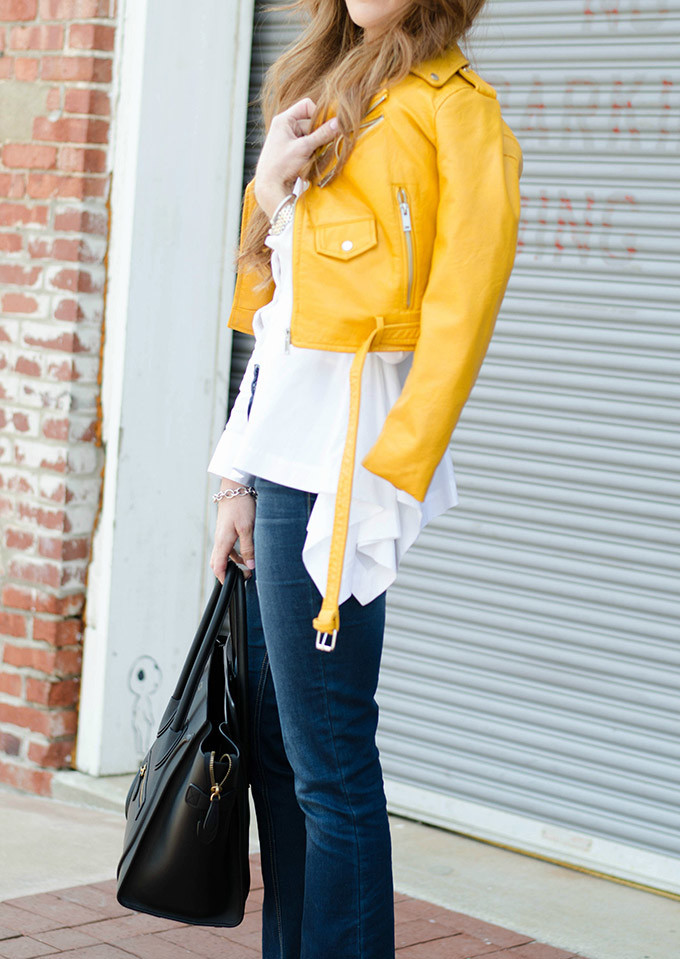 Today I am excited to style one of the gorgeous pieces from the Olivia Palermo x Chelsea28 collection. When I heard about this collaboration, I was DYING to see the pieces. The collection features classic American sportswear stapes but with a modern-feminine touch. This peplum white button down immediately caught my attention. I love the large ruffle back as it adds instant drama to any look its paired with. I wore this look in NYC for a couple showroom meetings. I paired it with a vivid yellow moto jacket and flared denim. I typically don’t reach for denim when planning my NYFW looks, but this top dressed up my denim perfectly.