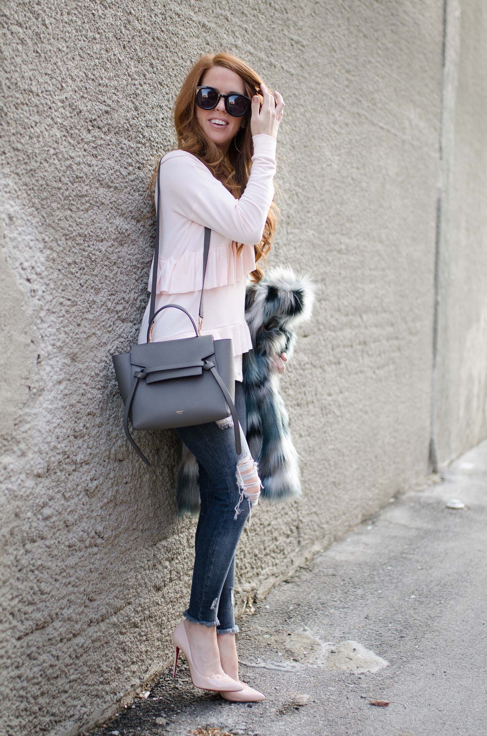 When I found out I was having a little girl over 4 years ago, I knew a lot of pink and ruffles were in my future. What I did not know, is that I would be the one wearing them haha. All kidding aside, ruffle detailed pieces are a huge trend right now. Ruffles add a fun and playful touch to a look. I fell in love with this gorgeous blush pink ruffle sweatshirt as soon as I saw it. It is the softest material and I adore the casual yet dressy feel of it. I wore it during the day with my adidas and dressed it up later that night with a gorgeous teal and grey faux fur coat. My mom got me this coat for Christmas to wear for a trip we are going on next month, but in true Tara form, I couldn’t wait to wear it! The mix of grey and deep teal hues makes it the perfect winter faux fur coat.