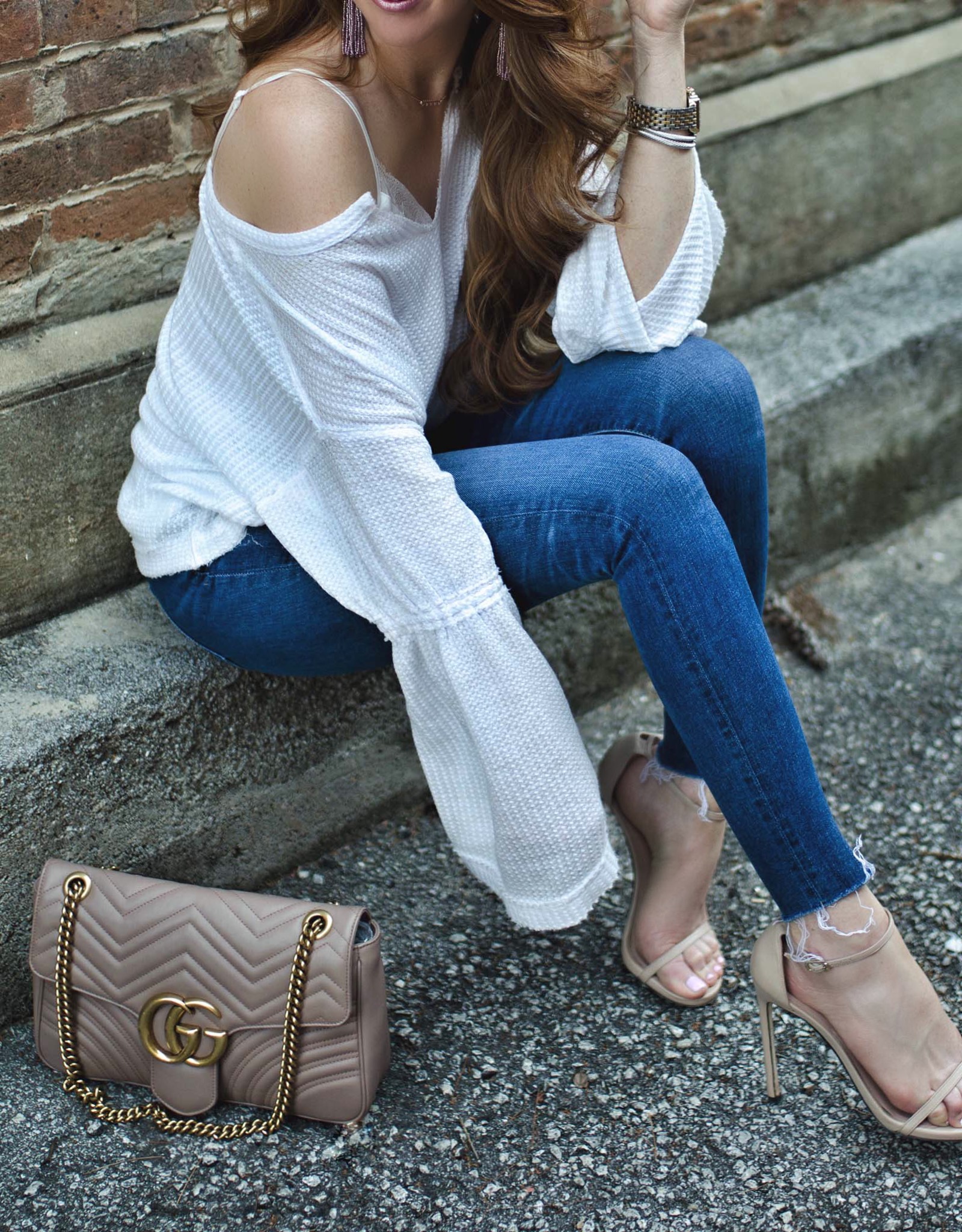 TOP Free People | CAMI BP| JEANS AG | SANDALS Stuart Weitzman (similar under $120) | BAG Gucci (loving this) | SUNGLASSES Karen Walker | WATCH Michele | BRACELETS David Yurman (one,two) | NECKLACE Kendra Scott c/o (new fall collection!)