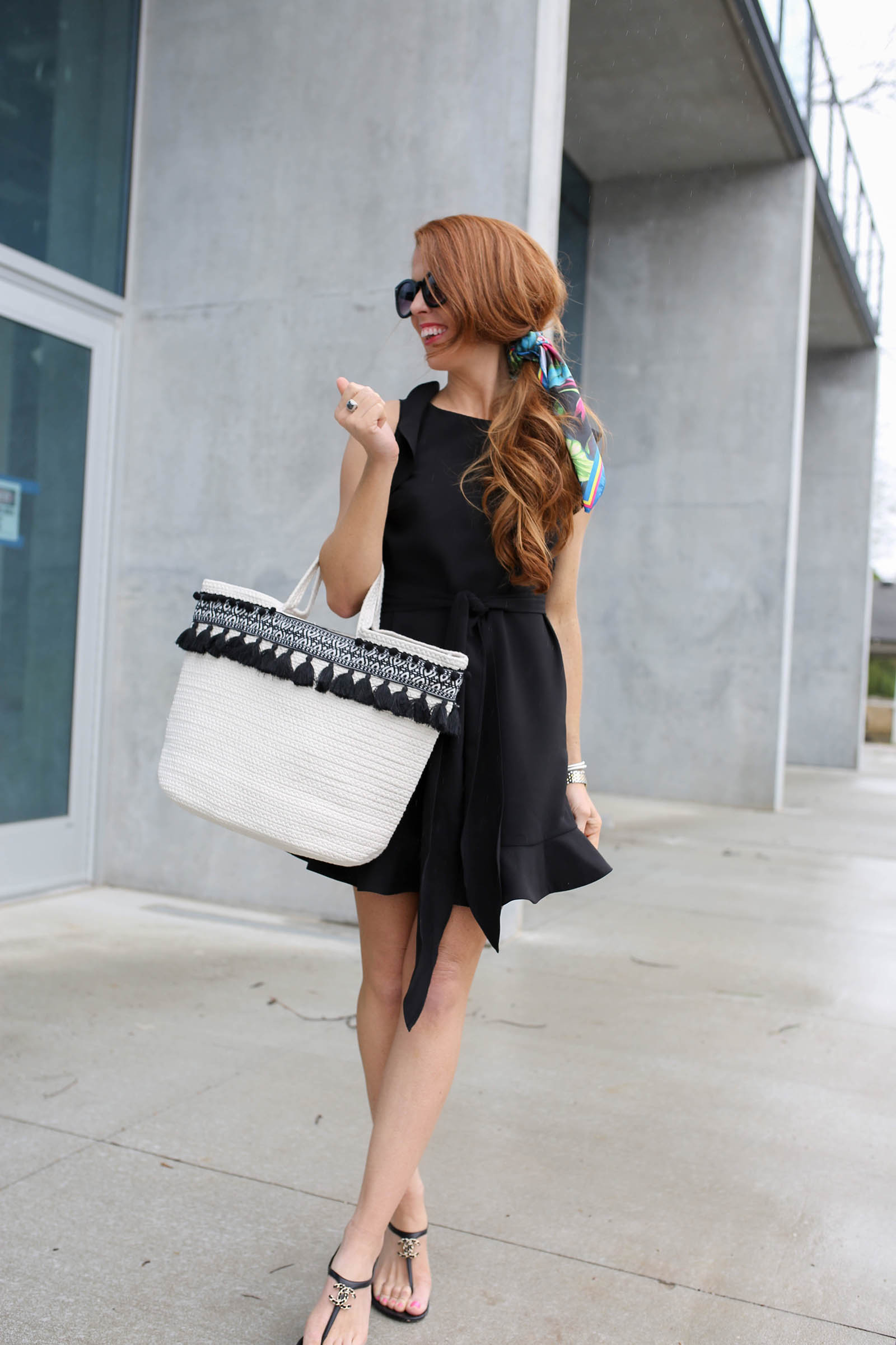 Lastly, I styled this cute dress for a casual vacation look. I tied the sash into a knot in the front and paired it with a simple black sandal. Carry your favorite beach tote and tie a scarf in your hair to make this dress vacay ready.